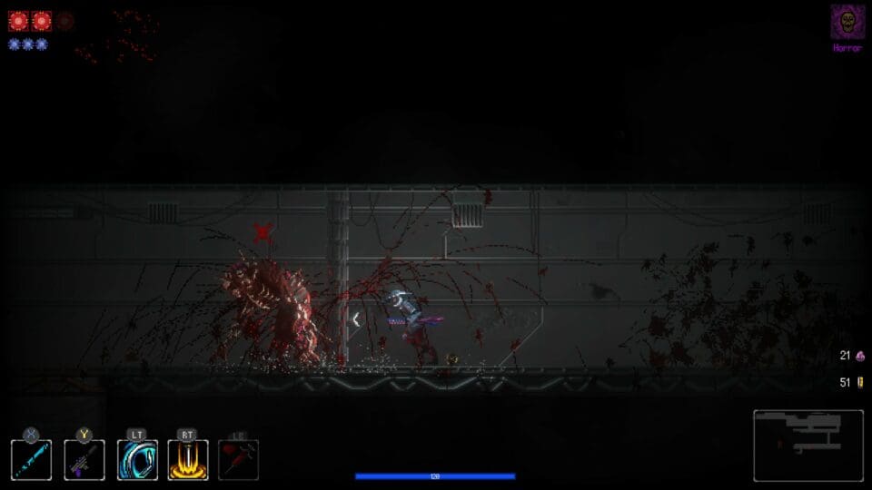 Bei den Kämpfen spritzt das Pixelblut eurer Feinde. Nachdem das Spiel in 2D ist, kommt es schnell einmal vor, dass man vor lauter herumspritzendem Blut nicht mehr viel sieht. Das erschwert es, den Standort der Gegner zu erkennen und auch zu sehen, ob sie gerade einen Angriff vorbereiten. Kurz – die Kämpfe sind teilweise recht chaotisch. Vor lauter Blut seht ihr auch die herumliegenden nützlichen Gegenstände nur schwer.