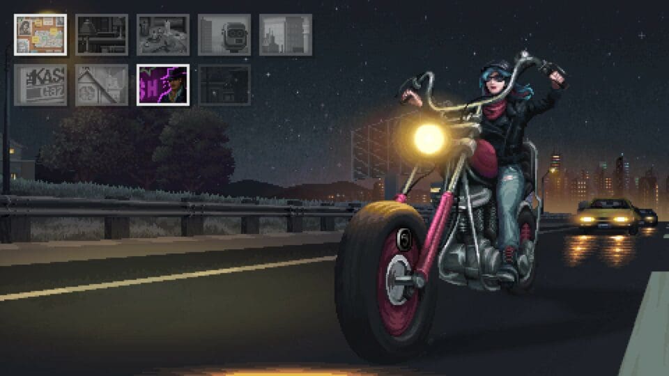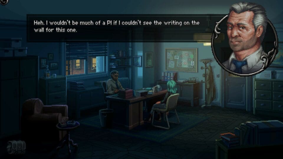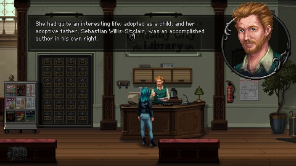 Die Grafik von Kathy Rain 2: Soothsayer ist überaus gut gemacht – Pixel Art im Stil alter 16-Bit Spiele, voller liebevoller Details. Die Grafiker verstehen ihr Handwerk wirklich, ich habe selten eine derart gut gemachte grafische Umsetzung gesehen. Das erst kürzlich erschienene (und durchaus gute) Rosewater beispielsweise verwendet einen ähnlichen Stil – aber die grafische Qualität in Kathy Rain 2: Soothsayer ist deutlich höher. Detaillierte Umgebungen, stilvolle Farbwahl, gute Animationen – erinnert mich an die grafischen Meisterleistungen in den Adventures von LucasArts vor vielen, vielen Jahren. Die Steuerung geht leicht von der Hand – ein Klick auf ein Objekt, um eine Aktion durchzuführen. Ein Klick auf das Inventar, um es zu öffnen. Inventargegenstand auf Hotspot ziehen, um das Objekt damit anzuwenden. Gespräche laufen im Multiple-Choice Verfahren ab, wobei es hier eine Besonderheit gibt – ihr könnt euren Gesprächspartner auch über alle Hotspots in Sichtweite ausfragen. In einem Notizbuch werden automatisch die offenen Aufgaben niedergeschrieben.