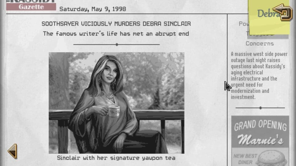 Und so beginnt das Spiel. Es ist in Tage gegliedert, immer wenn alle Aufgaben eines Tages erledigt sind, kehrt Kathy in ihre Wohnung zurück und schlaft bis zum nächsten Tag. Am ersten Tag recherchiert Kathy über die bisherigen Morde in der Stadtbibliothek. Das letzte Opfer war eine bekannte lokale Romanautorin, aber wer waren die anderen Leichen? Mit Hilfe von Mikrofilm (das Spiel handelt im Jahr 1998) und dem Telefonbuch (das waren noch Zeiten…) wird das rasch eruiert, um dann am nächsten Tag die Orte der Morde aufzusuchen. Scheinbar spielt auch eine neue, mysteriöse Droge eine wichtige Rolle bei allen Morden – also schnell einen Besuch bei Kathy’s Drogendealer, der auch rasch einen möglichen Kontakt zum Erhalt der Droge bekannt gibt. Mal sehen, ob Kathy dem Killer auf die Spur kommt… oder ob sie selbst als weiteres Opfer endet.