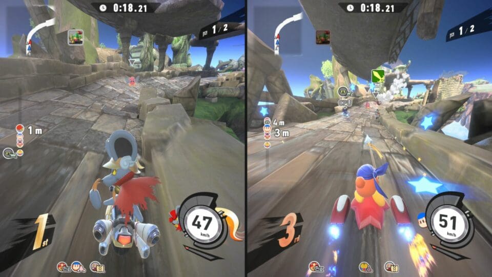 Während die unterschiedlichen Fahrzeuge, Power-ups und Events für abwechslungsreiche Partien sorgen und das Sammeln von Upgrades Spaß macht, entsteht vor allem durch den schnellen Spielfluss und die simple Steuerung ein echtes „Nur-noch-eine-Runde“-Gefühl. Zwar fehlt ein langfristiges Progressionssystem, doch der hohe Multiplayer-Spaßfaktor sorgt dafür, dass Kirby Air Riders dennoch lange motivierend bleibt.