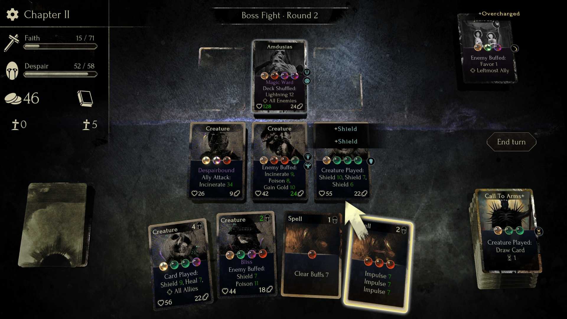Der österreichische Solo-Entwickler Philipp Lehner sagt, er habe sich von den Mechaniken von Magic: The Gathering und dem Materia-System aus dem Original Final Fantasy VII inspirieren lassen. Er hat eine Mechanik entwickelt, die Spielenden neue kreative Freiheiten gewährt, wie man sie bisher selten in roguelike-Deckbuildern gesehen hat. Während es in Genre-Größen wie Slay the Spire oder Balatro üblich ist, sein Deck und seine Hand so zusammenzustellen, dass sich starke Synergien ergeben, geht Faith in Despair noch einen Schritt weiter.