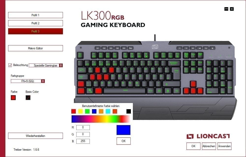 Für die Programmierung der Makros sowie der Beleuchtung kommt die bekannte Software zum Einsatz, welche man von der offiziellen Lioncast Webseite downloaden kann. Trotz simplem GUI-Design sind hier eine Vielzahl an Einstellungen möglich. Für meinen Geschmack etwas zu minimalistisch, denn viele Funktionen sind erst durch Ausprobieren ersichtlich und so erfordert das Programm dann doch eine etwas intensivere Einarbeitung. Alternativ ist es natürlich möglich, das Keyboard auch ganz ohne Software zu programmieren. Hier werden dann über bestimmte Tasten-Kombinationen Makros aufgezeichnet oder die Beleuchtung verändert. Für mich persönlich eindeutig die bessere und einfachere Option.