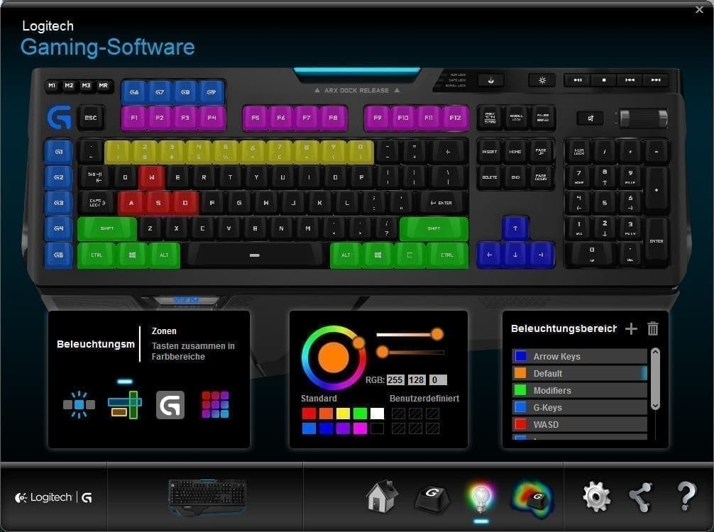 Die Software selbst ist schon wie bei den anderen Geräten von Logitech sehr übersichtlich aufgebaut und es können damit sowohl die Profile diverser Spiele eingestellt, die Makrotasten belegt, als auch die diversen Beleuchtungsmodi der Tastatur eingestellt werden. Über die Software können die Tasten mit folgenden Möglichkeiten beleuchtet werden:
