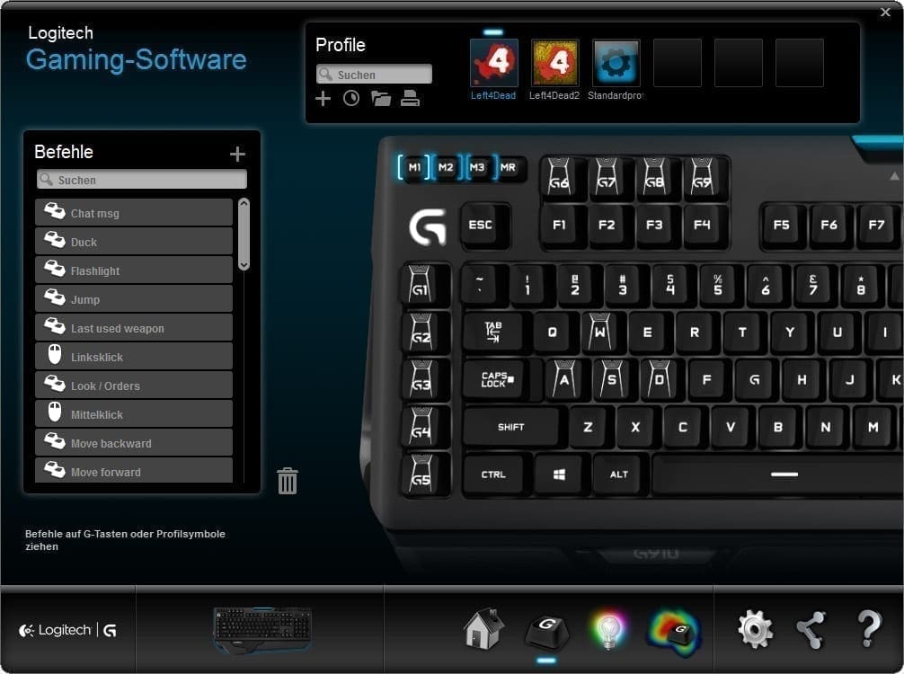 Diese Aussagen lasse ich jetzt mal so im Raum stehen, subjektiv konnte ich jetzt zwar zu anderen mechanischen Tastaturen beim schnellen Tippen eines Textes keinen Unterschied zur G19 feststellen. Wir haben die Tastatur natürlich aber auch mit einigen gängigen PC-Spielen wie „Mittelerde: Mordors Schatten“ ,“Battlefield 4″ oder „Ryse: Son of Rome“ getestet. Die Performance der Tasten ist wirklich sehr gut, die Bedienung in den versch. Spielen funktionierte, auch in hektischen Situationen, schnell und präzise. Mit der Logitech Gaming Software lassen sich sehr übersichtlich Spieleprofile erstellen und entsprechende Tastengruppen für das jeweilige Game individuell beleuchten.