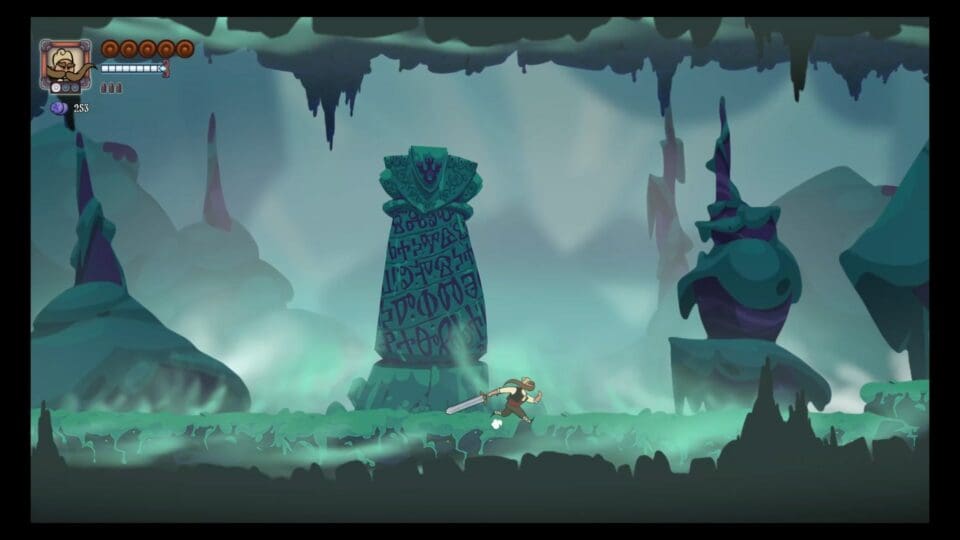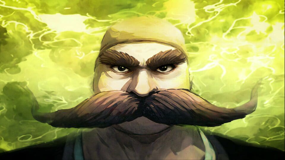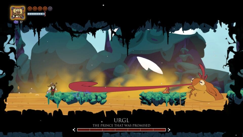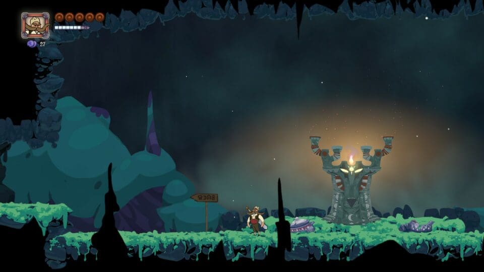 Wir spielen Marko, einen Dorfbewohner in einem kleinen ländlichen Ort in einem Land mit dem Namen Zagora (von den Karpaten inspiriert). Das Leben wäre wunderbar und wir würden immer noch in Ruhe ein paar Bäume fällen und unseren überdimensionierten Schnauzbart zwirbeln, wenn nicht plötzlich ein purpurnes dreiköpfiges Monster vor dem Ortseingang stehen würde, das unsere Freunde umbringt und auch uns von der einstürzenden Dorfbrücke wirft. Eigentlich sollten wir mausetot im Fluss entlang treiben, aber ein Hirsch mit riesigem goldenen Geweih erweckt uns wieder zum Leben und in einer verborgenen Höhle finden wir ein Schwert herumliegen, das nur auf uns gewartet hat. Es ist natürlich ein magisches Schwert, wenn wir damit Feinde zerhacken generiert das Mut. Und wenn wir genug Mut haben, können wir einige Lebenspunkte regenerieren, was auch schon eine der Kernspielmechaniken darstellt.