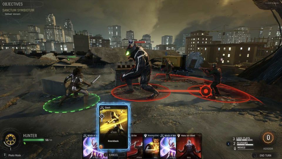 Entwickler Firaxis Games begründen diese Änderung damit, dass ein Superheld ja immer treffen sollte. Meiner Meinung nach ist das Kampfsystem aber eher geändert worden um nicht so taktikaffinen Spieler:innen dieses Spiel auch zugänglich zu machen, da das Setting vermutlich viele ansprechen wird, die noch nicht viele Berührungspunkte mit dem Genre hatten. Für XCOM-Fans wie mich macht es das Spiel dadurch ein wenig langweilig, jedoch wird das durch die spannende Geschichte und die gut geschriebenen Charaktere wieder gut gemacht. Ich habe in meiner ganzen Spielzeit nicht eine Mission verloren, jedoch war ich trotz des vereinfachten Kampfsystems mehrfach kurz davor. Durch die „Battle Deck“ Mechanik wird das Spiel ein bisschen zu einem strategischem Kartenspiel. Diverse Statuseffekte und Karten die mit dem Schlachtfeld oder den Handkarten interagieren sorgen dabei für die notwendige Portion Taktik.