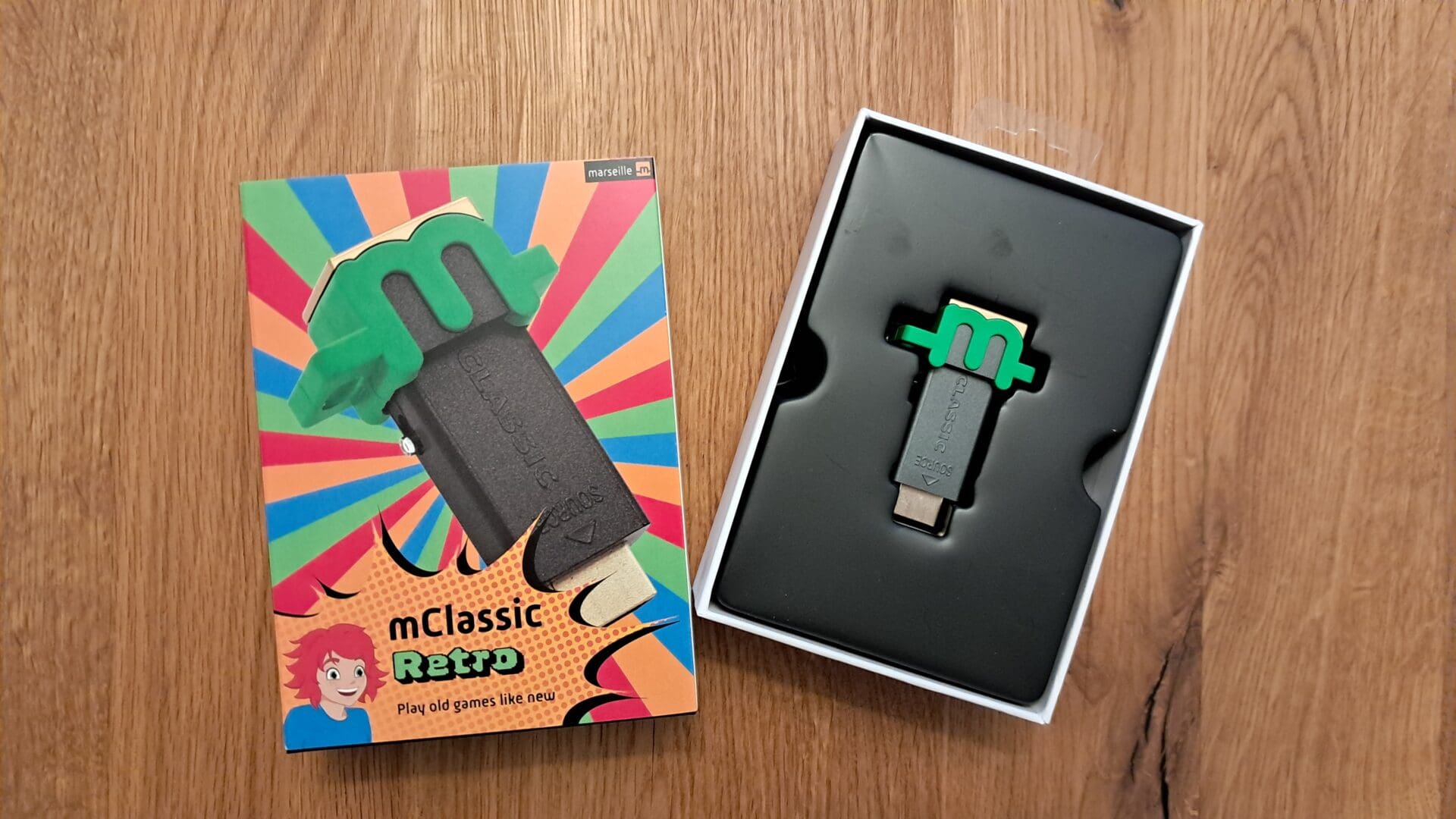 Im Paket war dann auch der mClassic Retro Stick von Marseille Inc. Es handelt sich dabei um einen der drei Sticks aus der mClassic RGB Collection. Neben dem mClassic Retro gibt es noch den mClassic Original und den mClassic Switch. Worum handelt es sich bei dem Stick denn nun eigentlich? Auf der Box seht ihr ein Bild des Sticks und den Text Play old games like new. Das nenne ich eine etwas dürftige Produktinformation.