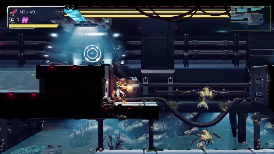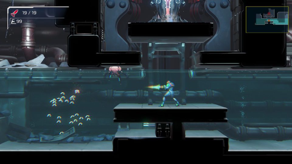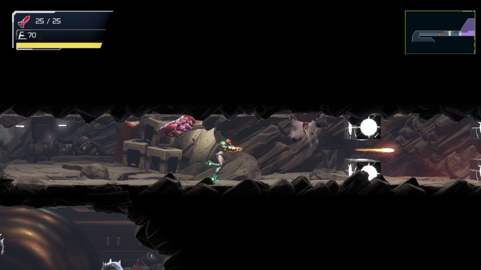 Während des Plattformens gilt es natürlich auch vieles anderes außerirdisches Gezücht zu besiegen. Dank Multifunktions-Kanonenarm feuert Samus unbegrenzt (schwächere) Laserstrahlen oder Raketen. Letztere sind jedoch limitiert und müssen durch Einsammeln oder durch Nutzung verschiedener Auffüllstationen erst wieder nachgeladen werden. Gut versteckte oder einfach nur schwer zu erreichende Upgrades erhöhen zumindest die maximale Anzahl unserer Raketen oder die maximale Energie unseres Schutzanzugs.