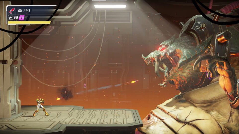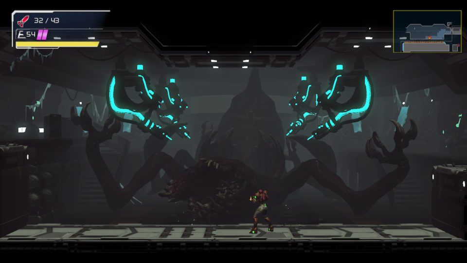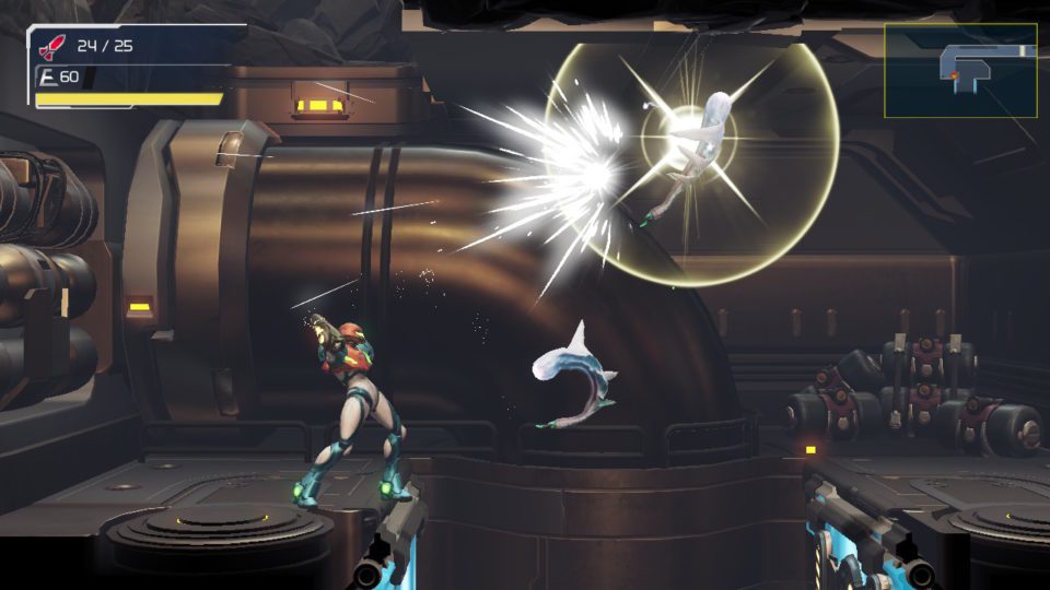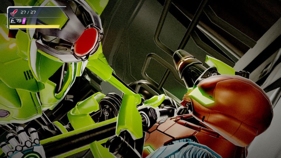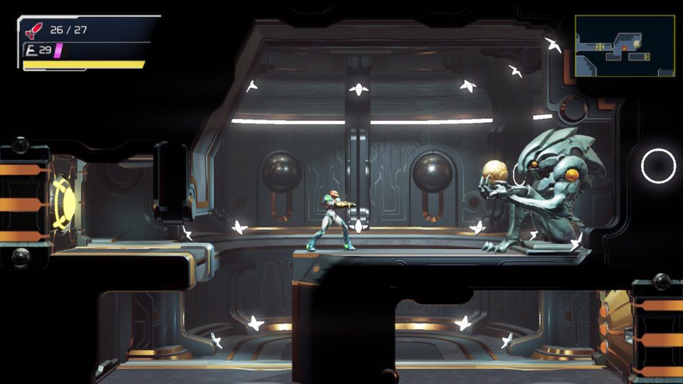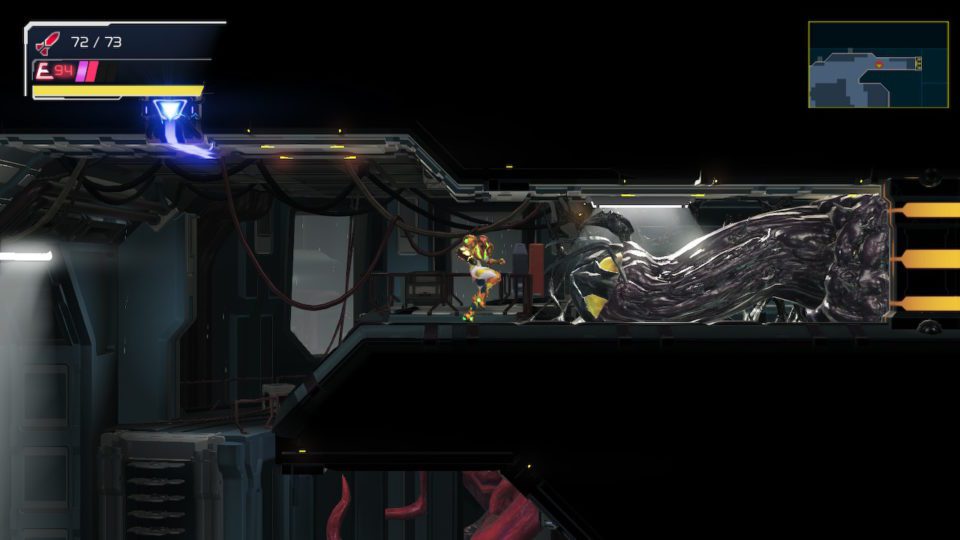 Die Abschnitte in denen man von den E.M.M.I. gnadenlos gejagt wird bringen etwas frisches Blut in die altbekannte Gameplay-Formel und erhöhen den Stressfaktor auch zwischen den wie immer knackigen Bosskämpfen. Je nach Spielertyp kann man sich entscheiden: Via neuem Stealth-Mantel und mit viel Geduld durch diese Passagen schleichen. Oder die Beine in die Hand nehmen und den nicht minder flotten Robotern einfach davonlaufen. Nachdem man ein paar Mal gejagt kommt dann aber stets die Rettung in Form eines Mini-Bosses. Zerstört man eine sogenannte Zentraleinheit verwandelt sich unsere Armkanone für kurze Zeit in die mächtige Omega-Kanone. Im Sperrfeuer kann man – aus hoffentlich sicherer Entfernung – die Kopfpanzerung der Horror-Roboter zerstören und Ihnen anschließend mit einem aufgeladenen Kopfschuss die CPU aus dem Sockel pusten.