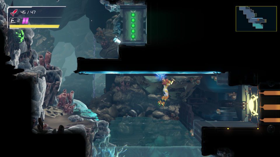 Wenn die eigene Serie als (Co-)Synonym für ein ganzes Genre steht, dann wäre es eine große Überraschung – und ein sicherlich nicht unerhebliches Risiko – wenn man plötzlich mit allen Konventionen bricht. Auch Metroid Dread folgt der klassischen Metroidvania-Formel: Eine große Karte, bestehend aus verschiedenen Zonen, will erforscht werden. Nur mit immer wieder neuen Gegenständen oder Fähigkeiten können weitere Bereiche erreicht oder entsperrt werden: Ein neuer Schuss zerstört eine bestimmte Art von Block, zu einem „Morphball“ zusammengerollt kommt man durch schmale Schächte, mit einem magnetischen Enterhaken über Abgründe usw. usf.