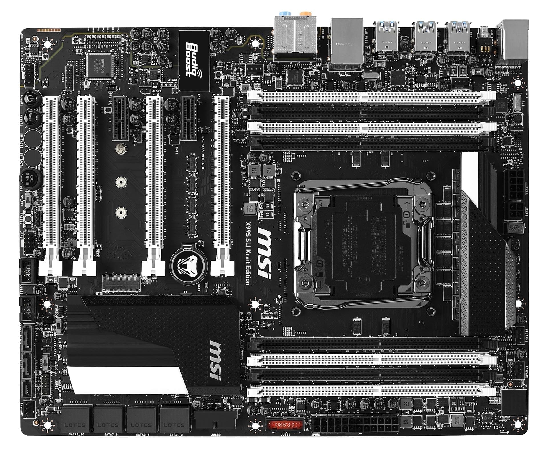 Zur umfangreichen technischen Ausstattung des X99S SLI Krait Edition zählen unter anderem vier PCI-Express 3.0 Slots mit je 16 Lanes, welche den gleichzeitigen Einsatz von multiplen Grafikkarten ermöglichen und sowohl Quad SLI als auch Quad Crossfire unterstützen. Hinzu kommen acht DIMM-Steckplätze für DDR4-Speicherriegel mit Geschwindigkeiten bis zu 3333 MHz (OC) und Speicherkonfigurationen bis zu 128 GB. Für die Massenspeicheranbindung bietet das X99S SLI Krait Edition neben zehn SATA 6 Gb/s-Anschlüssen – davon zwei innerhalb eines SATA-Express-Ports – auch eine Turbo M.2-Speicheranbindung, welche Übertragungsgeschwindigkeiten von bis zu 32 Gb/s und damit überragend schnelle Boot- und Ladezeiten ermöglicht.