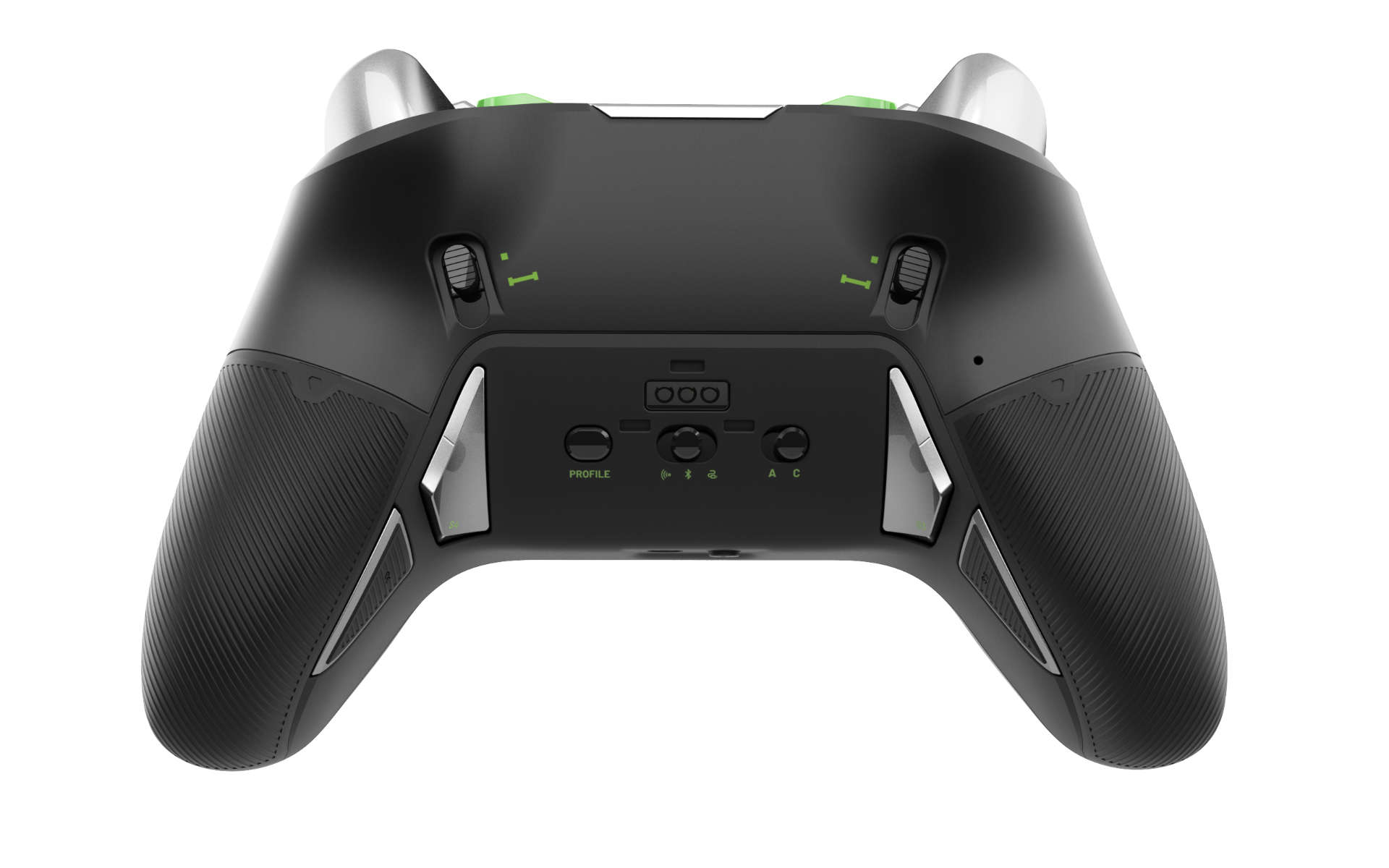 Auf der Ober- und Rückseite des Controllers wurden zahlreiche weitere Schiebeschalten, Buttons und Anschlüsse platziert. Diese alle zu erklären würde wohl fast schon den Rahmen dieses Artikel sprengen. So gibt es etwa eine eigene Mikro-Stummschaltetaste, einen Schalter für den sog. „erweiterten Modus“, eine Multifunktionstaste, Schalter um die Trigger zu blockieren und diese als Instant-Taste zu verwenden, eine Taste zum Umschalten von bis zu max. 20 Profilen und jede Menge zus. Buttons, die individuell belegt werden können.