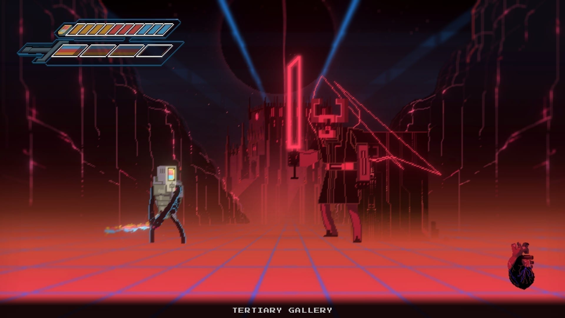 Die Entwickler bezeichnen ihr Spiel als ein RetroVania, also stellt sich die Frage, ob es sich bei Narita Boy um ein Metroidvania handelt. Ein Metroidvania zeichnet sich durch eine zusammenhängende Umgebung aus, durch die der Spieler ohne klare Zielvorgabe navigiert. Die Level sind begrenzt durch zunächst unüberwindbare Hürden, die sich aber später mit neuer Ausrüstung und neuen Fähigkeiten letztendlich meistern lassen. Typisch sind auch Gegner, die bei ihrem Tod ein Goldstück oder ähnliches hinterlassen, und die bei Verlassen des Bildschirmes wieder erscheinen. Bei Narita Boy trifft zwar ein Teil davon zu, es handelt sich jedoch keinesfalls um ein klassisches Metroidvania. Ein Backtracking zu bereits absolvierten Abschnitten ist nicht möglich. Ausgeschaltete Gegner hinterlassen keine Beute und erscheinen bei erneutem Betreten eines Raumes (im Regelfall) nicht mehr. Ich würde Narita Boy als ein lineares Action-Adventure bezeichnen, bei dem man sich langsam durch die Geschichte kämpft.