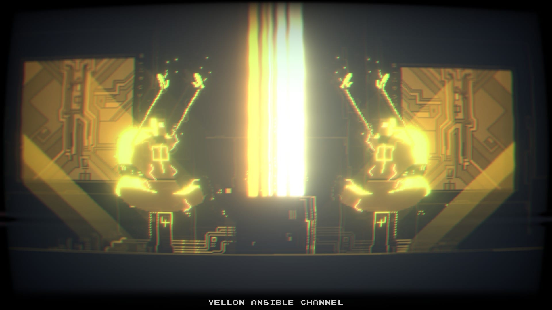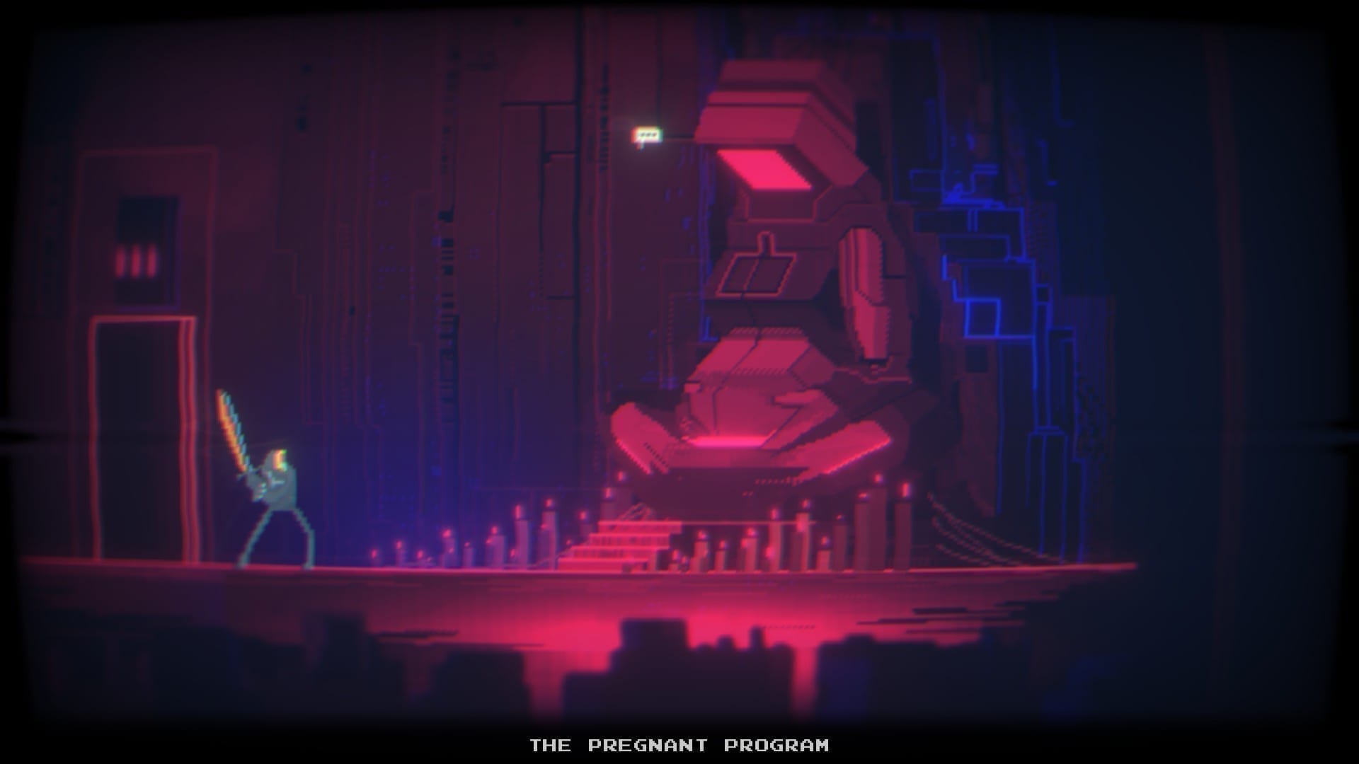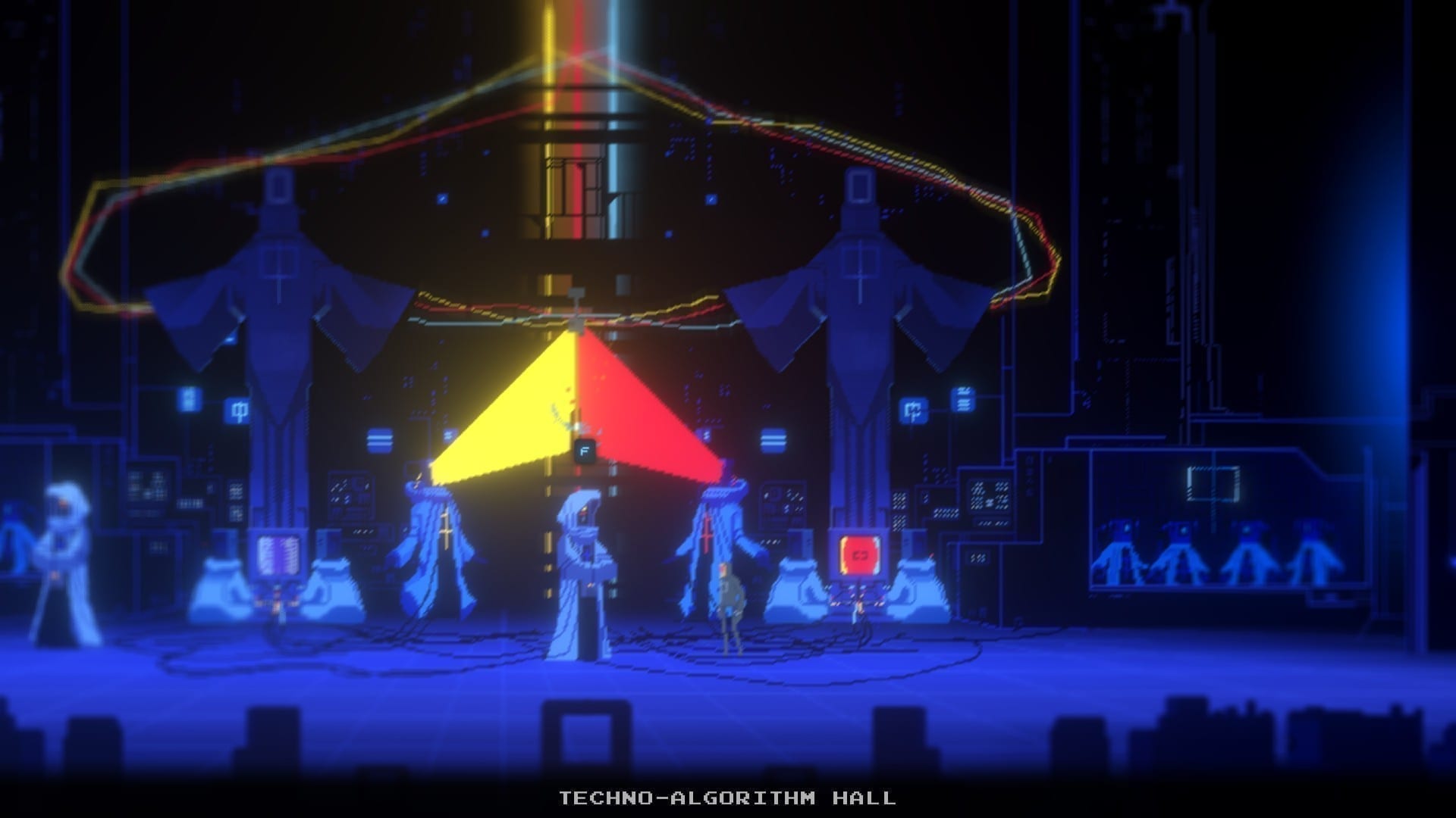 Die Story von Narita Boy ist vollkommen durchgeknallt. Sie spielt im Digitalen Königreich, das auf dem heiligen Quellcode basiert, der Zeile für Zeile vom Schöpfer entworfen wurde. Es wird bewohnt von empfindungsfähigen Programmen, die in Tempeln zu ihrem Schöpfer beten. Das Königreich ist voll mit religiösen Symbolen aller Art, wie heiligen Reliquien und Tech-Priestern, die in Tempeln den Strahl der Trichroma anbeten. Als ich zu Beginn des Spieles auf Motherboard getroffen bin, einem Supervisor-Programm und die schützende Mutter aller Programme im Digitalen Königreich, dachte ich, was für eine kreative Idee, aber zu meiner Überraschung setzt sich diese Kreativität während des gesamten Spiels fort. Fast jeder neue Raum bringt eine neue verrückte Idee, die oft nur visuell umgesetzt wurde, oft aber auch durch die Gespräche mit den Programmen vermittelt wird.