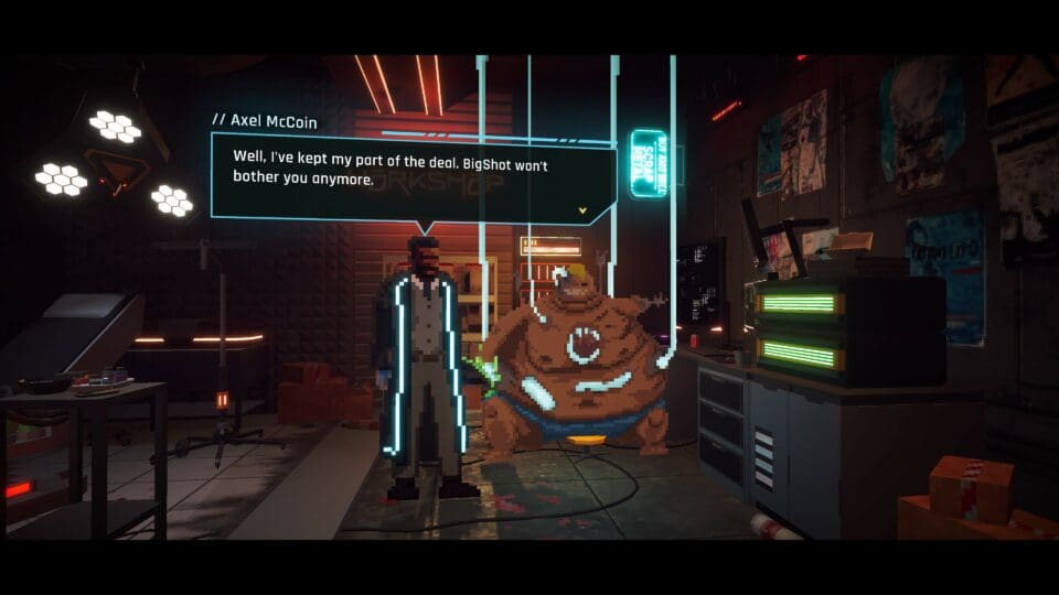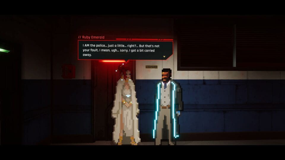 Rein technisch sind bei mir keine gröberen Bugs aufgetreten, auch wenn manchmal Interaktionsmöglichkeiten (wie z.B. Press E to talk) schlichtweg zu keiner Reaktion führen. Ihr steuert eure Figur über die WASD-Tasten, Interaktionen startet ihr mit der Taste E. Ihr könnt Laufen (wenn euch das Herumgehen zu langsam ist… also quasi immer) oder mit eurem Scan-Implantat die nahe Umgebung durchsuchen. Inventar gibt es übrigens keines, auch wenn euer Held manchmal Items aufnimmt, die dann an der richtigen Stelle verwendet werden. Die Verwendung eines Controllers zur Steuerung klappt ohne Probleme. Die Grafik besteht aus einer Mischung aus grob verpixelten Charakteren (wo man oft nicht einmal erkennt, was die darstellen sollen) und neon-durchtränkten Hintergründen in höherer Auflösung. Diese Mischung hat mir schon in Between Horizons nicht sonderlich gut gefallen, aber das ist Geschmackssache. Sprachausgabe ist nicht vorhanden. Gespeichert wird automatisch (nicht nur jedes Kapitel, aber ihr müsst oft trotzdem einiges noch einmal durchspielen, wenn ihr am nächsten Tag weiterspielt), Cloud Speicherstände werden nicht unterstützt. Es gibt nur einen Spielstand – wenn ihr ein neues Spiel startet, wird der alte Speicherstand überschrieben.