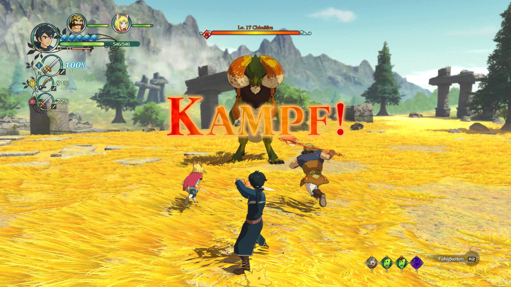 Das Kampfsystem von Ni No Kuni 2: Schicksal eines Königreichs gestaltet sich außerordentlich dynamisch. Die in Echtzeit ablaufenden Kämpfe bieten Variationsmöglichkeiten aus leichten und schweren Nahkampfattacken, Fernkampf (je nach Figur mit Bogen, Handfeuerwaffe, oder Magie) und Spezialangriffe. Jede Figur kann bis zu vier Spezialangriffe auf einmal ausrüsten. Ni No Kuni 2: Schicksal eines Königreichs bietet hierbei allerdings einen interessanten Kniff: die Stärke der Spezialangriffe ist direkt mit der Aufladung der ausgerüsteten Waffe verbunden. Man mag jetzt sagen, dass es sich hierbei um eine Standartfunktion bei Action – RPGs handelt. Allerdings würde man mit dieser Aussage nur teilweise recht behalten. Im Vergleich zu ähnlichen Systemen ist es in Ni No Kuni 2: Schicksal eines Königreichs nämlich möglich einer Figur bis zu drei Nahkampfwaffen auf einmal auszurüsten. Dadurch entsteht ein interessanter Drive. Ich lade eine Waffe mit Kombos bis zum Maximum auf, wechsle durch Betätigung der L2 Taste (PS4) im Kampf fliesend auf die nächste und hau dann bei Bedarf meine Spezialattacken raus. Es ist möglich bei jedem Ladungsstand der Waffe Spezialattacken zu verwenden, allerdings entfalten sie erst bei 100% Waffenaufladung ihr komplettes Zerstörungspotenzial. Da es auch möglich ist per Steuerkreuz jederzeit zwischen jeden der maximal drei Gruppenmitglieder zu wechseln entsteht eine sehr schöne Dynamik im Kampf.