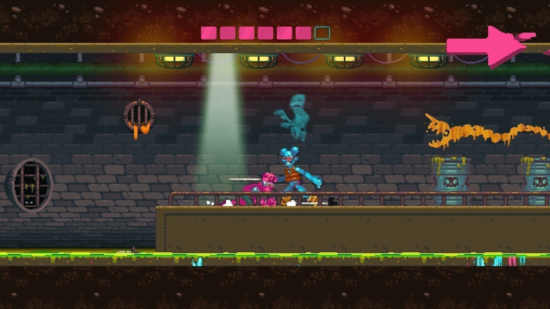 Der Begriff Nidhogg kommt aus dem altnordischen und bedeutet so viel wie „der hasserfüllt Schlagende“. Er ist in der nordischen Mythologie auch ein schlangenartiger Drache, der am Weltenbaum Yggdrasil lebt und die Toten peinigt. Was das mit dem Spiel Nidhogg zu tun hat? Ganz einfach: Ihr kämpft euch meist schlagend durch die mehrere Bildschirme umfassende Arenen und versucht dabei euren Kontrahenten so oft und so brutal wie möglich auszuschalten. Seid ihr dann schlussendlich erfolgreich und erreicht das Levelende, dann werdet ihr als Belohnung vom namens gebenden Wurm ganz einfach aufgefressen. Klingt komisch, ist es auch – und das gleich in mehrerer Hinsicht. Einerseits weil die Grundidee so simpel wie auch schräg ist, andererseits weil genau dadurch hektische, aber unterhaltsame und extrem spaßige Duelle entstehen. Vor allem dann, wenn man seinen Gegner direkt neben sich auf der Couch sitzen hat. Pro Duell habt ihr nämlich nur einen Gegner. Den müsst ihr daran hindern, den gegenüberliegenden Bildschirmrand zu erreichen und im Gegenzug versucht ihr das selbe. Habt ihr beispielsweise euren Gegner mittels Waffengewalt oder bloßen Fäusten ausgeschaltet, dann befindet ihr euch quasi im Angriffsmodus und dürft loslaufen. Erwischt euch euer Gegner, dann wird der Spieß umgedreht und es geht in die entgegengesetzte Richtung. Gewinner ist jener Spieler, der als erstes die Final Stage erreicht und dann vom Wurm aufgefressen wird.