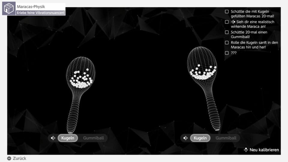 - HD Rumble 2.0: Die verbesserte Vibrationsfunktion wird durch spezielle Demos, etwa eine Maracas-Physik-Station, besonders hervorgehoben. Hier wird deutlich, wie feinfühlig und nuanciert die neue HD-Rumble-Technologie arbeitet.