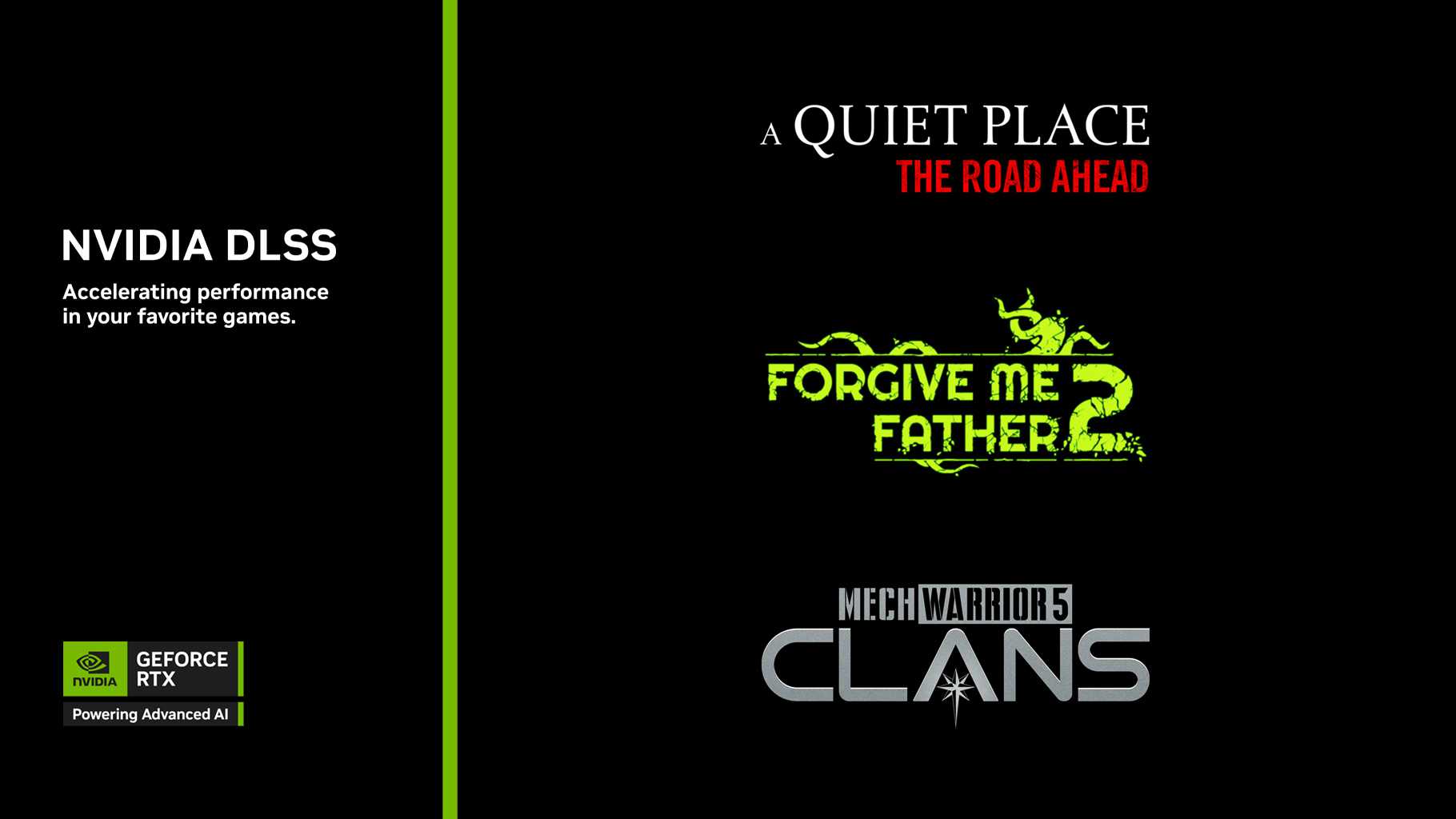- Die Schrecken des Überlebens warten im Singleplayer-Abenteuer A Quiet Place: The Road Ahead, inspiriert von der erfolgreichen Filmreihe. Das Spiel erscheint ebenfalls am 17. Oktober und bietet Day-One-Unterstützung für DLSS 3 und DLAA, um GeForce-RTX-Spielern die bestmögliche Grafikqualität beim Navigieren durch die apokalyptische Landschaft zu bieten.