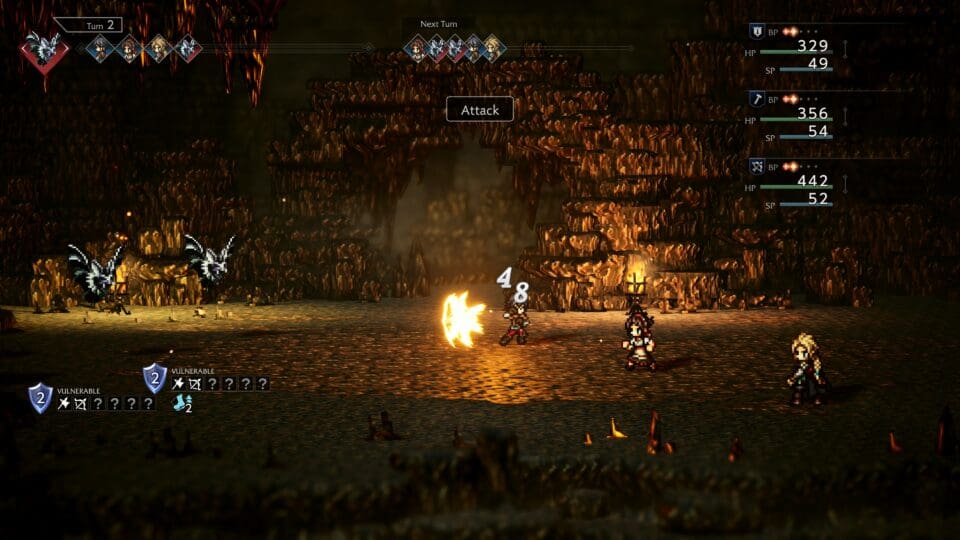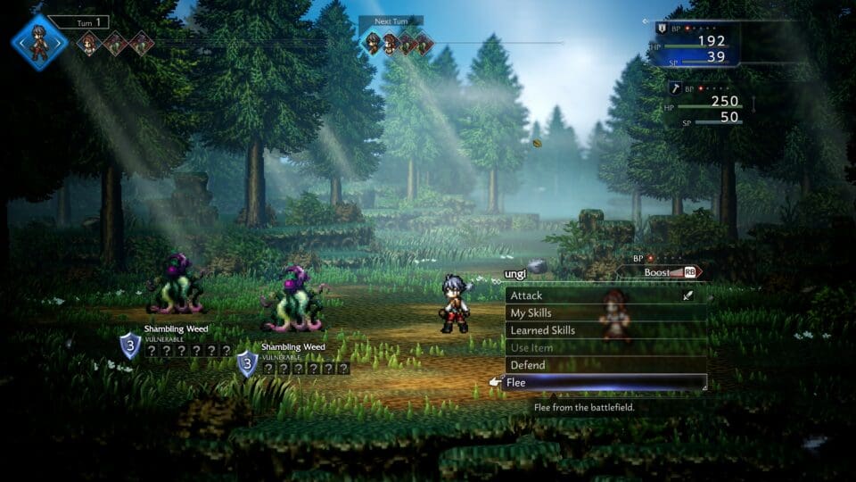 Kämpfe laufen JRPG-üblich ab. Wir wählen für jeden Charakter unserer Gruppe entweder angreifen, eine Fähigkeit anwenden, einen Gegenstand benutzen, verteidigen oder fliehen aus, unsere Gegner tun das selbe und nachdem alle ihre Aktion ausgeführt haben beginnt das Ganze in der nächsten Runde für alle noch lebenden Teilnehmer des Kampfes von vorne. Aktionen werden sofort ausgeführt, wir können einen Feind also töten, bevor er eine Aktion ausführen kann. Figuren können Statuseffekte erhalten – von beispielsweise vergiftet, blutend, blind bis zu gelähmt oder fixiert auf einen Gegner. Nach dem (erfolgreichen) Kampf gibt es Erfahrungspunkte und möglicherweise ein wenig Beute. Mit genug Erfahrungspunkten kommen Levelaufstiege und die zahlreichen Charakterattribute können sich verbessern. Der Rollenspielteil bei der Charakterentwicklung ist recht ausgeprägt – von 10 verschiedenen Attributen (wie Geschwindigkeit, Genauigkeit über Hitpunkte und Magiepunkte) zu besonderen Fähigkeiten (wie Spezialangriffen) über diverse Waffen, Kleidungs- und Ausrüstungsgegenständen ist alles vorhanden und kann für jedes der bis zu acht Mitglieder eurer Gruppe in Ruhe angesehen (und verändert) werden.