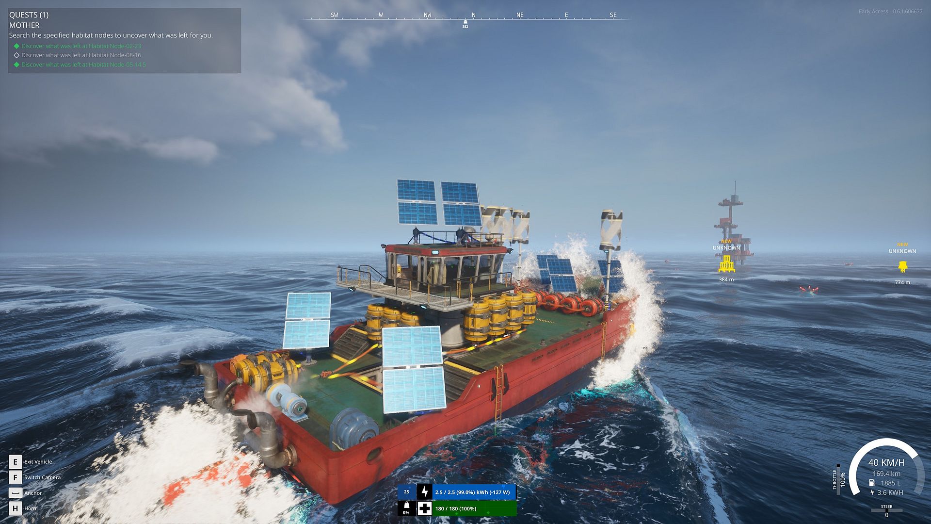 Der Spielfluss ergibt sich anfangs vor allem aus der Erkundung der Oberwasserwelt. Mit einem aufrüstbaren und vor allem „bebaubaren“ Schiff schippern wir über den Ozean. Verlassene Orte werden nach brauchbaren Materialien durchsucht, Anlagen werden repariert oder reaktiviert und aus dem Gefundenen entstehen Maschinen, Werkzeuge und Upgrades. Neben diesem Genre-typischen Kreislauf des Sammelns, Herstellens und Upgradens stellen biologische und mechanische Überbleibsel der Apokalypse uns auch vor gelegentliche kämpferische Herausforderungen. Diese sind allerdings meist gut planbar und der Fokus bleibt auf Erkundung, Crafting und der Suche nach Antworten.