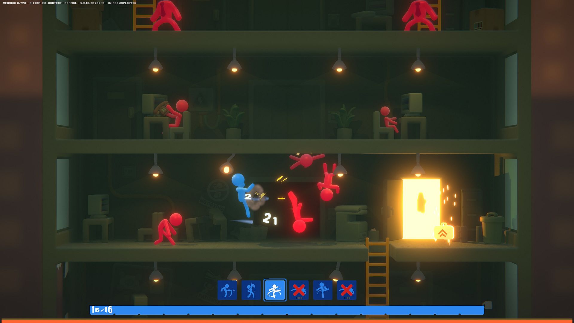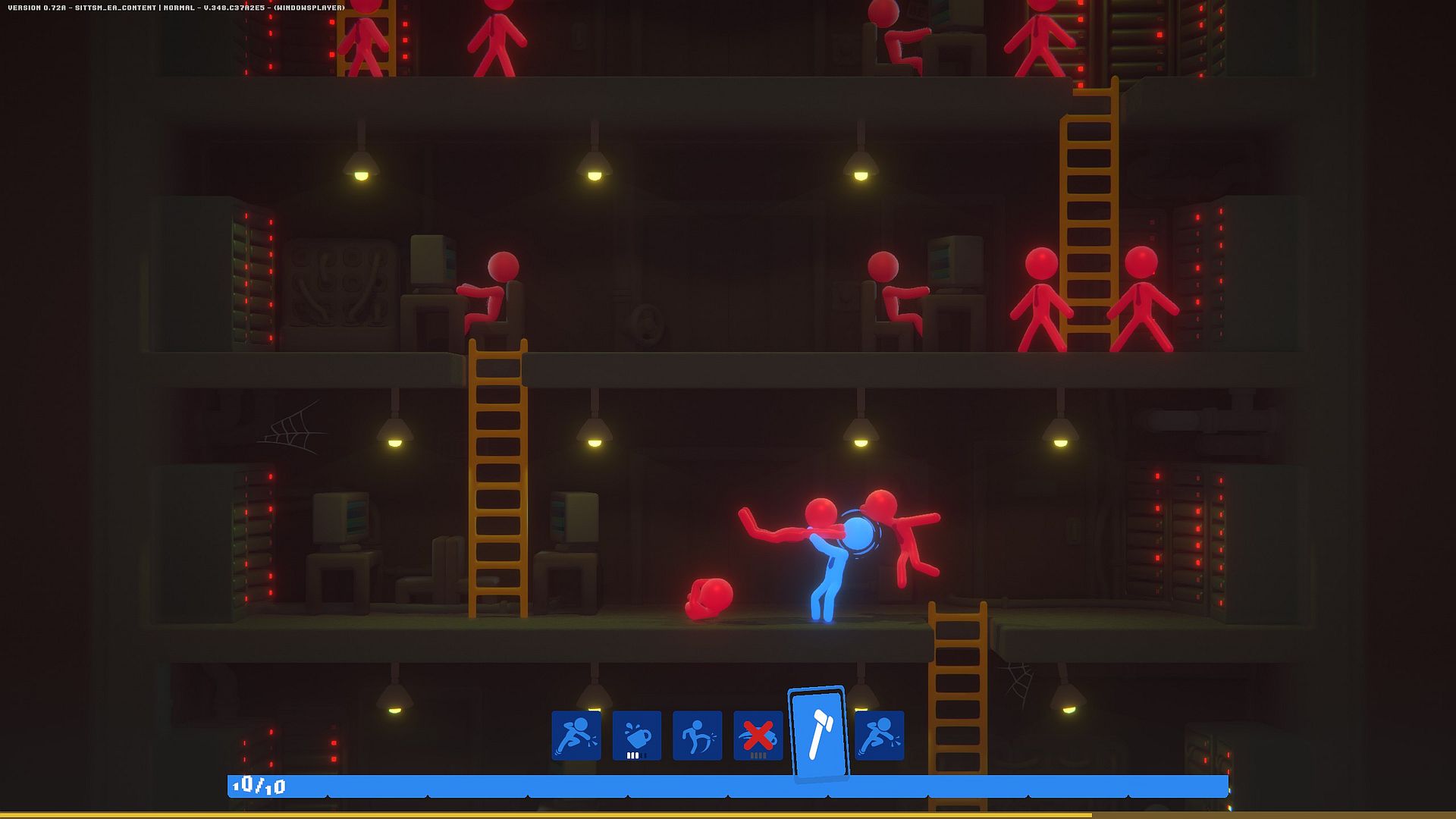 Gespielt wird aus der Seitenansicht, wobei sich unsere Figur – ein entnervter Konzernmitarbeiter, der seinem Dasein als Systemrädchen endlich entkommen will – durch die Etagen seines (bald ehemaligen) Arbeitgebers kämpft. Es gilt, sich gegen Wellen von Gegnern zu behaupten. Schläge, Tritte, Würfe und Umgebungsobjekte lassen sich kombinieren, um möglichst effektive oder einfach nur spektakuläre Angriffe auszuführen. Die Physik-Engine macht dabei (natürlich unbezahlte) Überstunden: Körper fliegen, kollidieren, prallen ab und verursachen Kettenreaktionen, die oft unvorhersehbar ausfallen. Kontrollverlust ist die gewollte Prämisse.