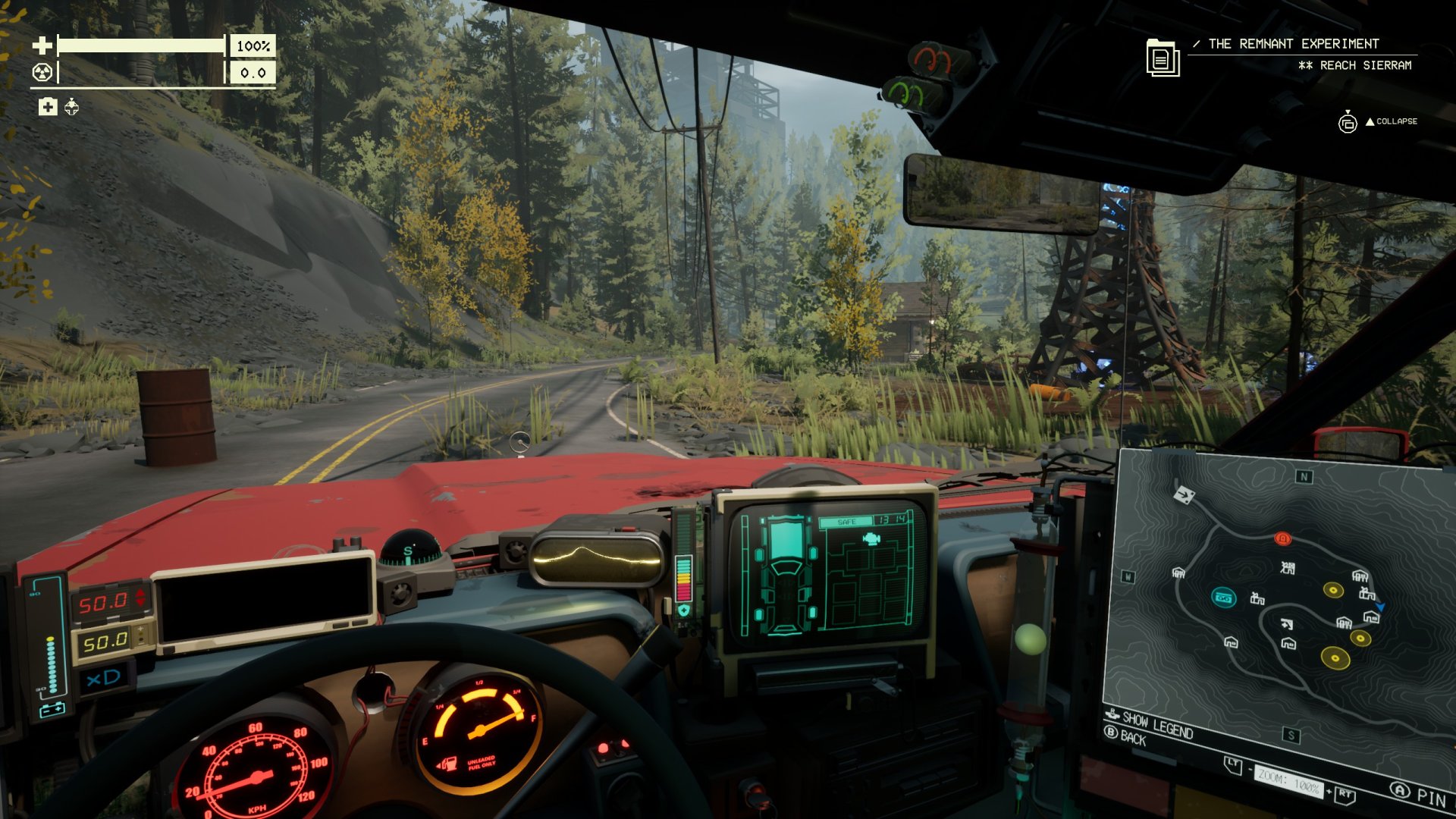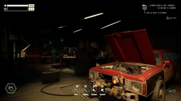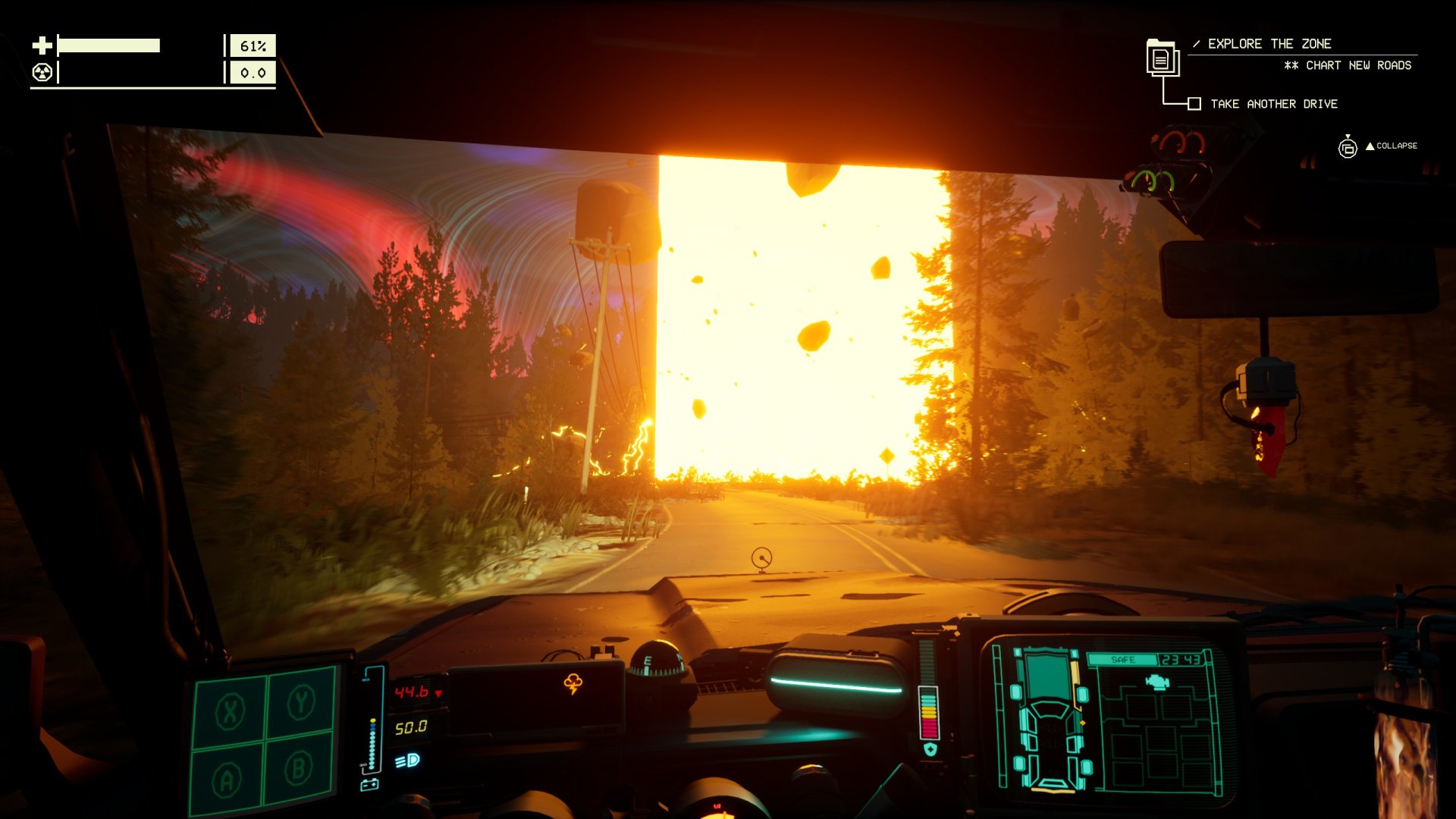 Schnell wird klar: Unser Kombi im Stil der in Amerika so berühmten „Station Wagons“ ist Transportmittel, mobiler Schutzraum und bester Freund zugleich. In unserer Basis, einer verlassenen Autowerkstatt, reparieren wir unser Gefährt, tauschen Türen, Reifen und Karosserieteile aus und basteln Upgrades aus in der Zone gefundenen Ressourcen. Der Kofferraum wird mit überlebenswichtiger Ausrüstung beladen und der nächste „Road Trip“ in die Zone geplant. Dabei folgt man entweder der etwas seichten Hintergrundgeschichte und/oder sammelt einfach nur Ressourcen. Das Spiel versteht es dabei geschickt uns ständig an die enorme Wichtigkeit unseres Transportmittels zu erinnern. Mit verschiedenen Werkzeugen bewaffnet steigt man zwar immer wieder aus um verlassene Fahrzeuge, Tankstellen und Häuser zu plündern, Strahlung, Energiestürme und andere tödliche Phänomene treiben uns aber immer wieder zurück in die vermeintliche Sicherheit unseres Gefährts. Der allgemeine Schwierigkeitsgrad ist dabei nicht ganz ohne und man muss immer damit rechnen, dass ein Ausflug mal schiefgeht und wir mit einem möglicherweise ohne Beute und nur mit einem schwer beschädigten Fahrzeug zurück in die Werkstatt rollen …