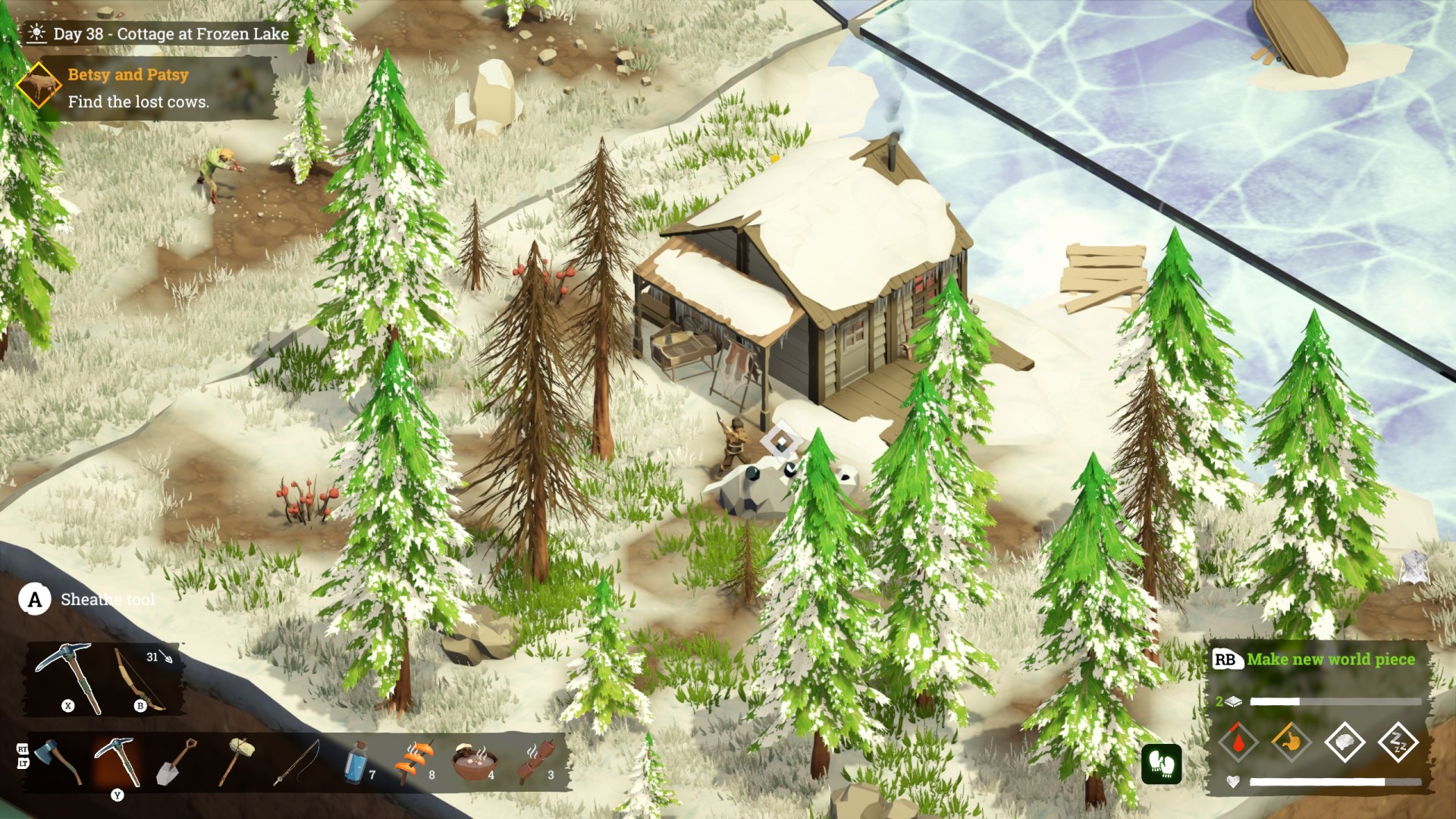 Eine kreative Idee bringt das Spiel nämlich mit: Es gibt keine vordefinierte Karte und die Welt wird auch nicht prozedural generiert. Stattdessen starten wir auf einer einzigen kleinen Landschaftskachel, deren Grenzen wir anfangs auch nicht verlassen können. All unsere Aktionen generieren Erfahrung und haben wir genug davon gesammelt, dürfen wir eine weitere Landschaftskachel platzieren und erforschen. Neue Kacheln bieten neue Ressourcentypen und/oder treiben die Story voran, müssen aber oft erst durch den Einsatz von Ressourcen erforscht werden. Beim Platzieren sollte man sich auch immer etwas Luft lassen und vorausschauend planen. Die Übergänge zwischen unterschiedlichen Biomen – z.B. Prärie und Wüste – müssen stets auf allen Kachelseiten passen und es bedarf oft entsprechender „gemischter“ Kacheln.