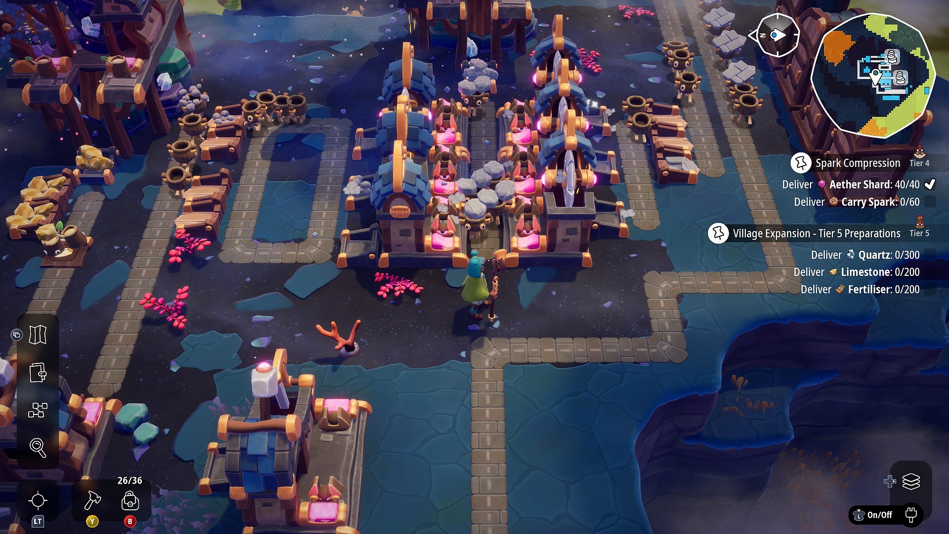 Im Kern geht es darum, Ressourcen zu sammeln, Verarbeitungsketten aufzubauen und Produktionswege zu organisieren. Sparks werden ausgesendet, um Rohstoffe wie Holz oder Stein abzubauen und an Gebäude zu liefern, die daraus verschiedenste (Zwischen-)Produkte herstellen. Durch das Erledigen von Quests oder den Bau bestimmter Strukturen werden neue Technologien freigeschaltet, die neue und effizientere Sparks oder verbesserte Gebäude ermöglichen.