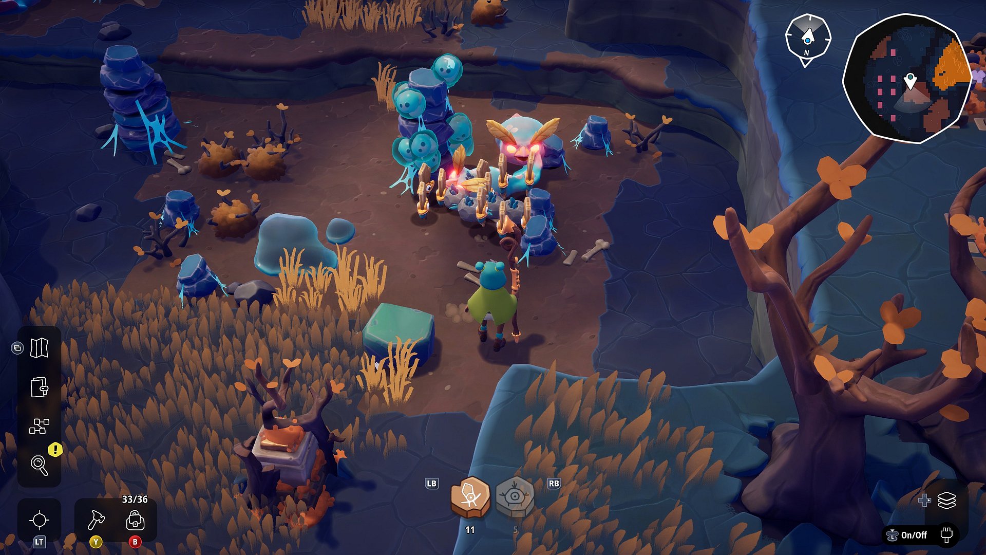 Viele Abläufe kann man also planen, aber immer wieder müssen Sparks manuell gelenkt werden. Das trifft vor allem auf die Erforschung neuer Regionen, sowie auf die Kämpfe zu. Die Welt selbst ist in Biome unterteilt, die zufällig generiert werden und nach und nach mit neuen Ressourcen, Gegnern und Aufträgen aufwarten. Die vorwiegend optionalen Kämpfe – meist nur nötig um an bestimmte Ressourcen zu gelangen – laufen eher passiv ab, indem man seine Sparks einfach in Richtung eines Gegners schickt. Außer einem Rückzugsbefehl um z.B. einem Flächenangriff auszuweichen, gibt es allerdings keine tiefergehenden taktischen Möglichkeiten, um diese Auseinandersetzungen stark zu beeinflussen.