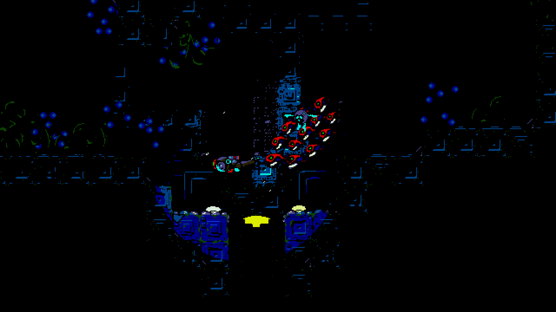 Nach der Manier eines klassischen Metroidvanias finden wir uns in einer nicht-linear aufgebauten zweidimensionalen 16-Bit Welt wieder. Dieselbe können wir nach Herzenslust in alle Richtungen frei erkunden; zumindest solange, bis wir an unüberwindbar scheinende Hindernisse stoßen. Dazu gehören verschiedenfarbig versiegelte Schleusen oder aber natürliche Hindernisse, wie durch Springen nicht zu bezwingende Höhen oder durch Stacheln versperrte Wege. Immer wieder sind wir dazu gezwungen uns neue Routen durch den Atlantik zu bahnen. Genau hierin besteht der Reiz eines Metroidvania. Entgegen herkömmlichen Plattformen und Jump’n’Runs, wie beispielsweise Super Mario, lädt uns die Welt von Bahlam zu einer maritimen Entdeckungsreise ein. Das Spiel ist in fünf große und ästhetisch unabhängig gestaltete Gebiete aufgeteilt und wartet mit ebenso vielen Bossgegnern auf. Die unterschiedlichen Bereiche sind mal durch Gänge, mal – weitere Strecken überbrückend – durch Portale miteinander verbunden. Zunächst beherrscht Bernstein jedoch lediglich sehr basale Fortbewegungsmöglichkeiten: Gehen, Laufen, Kriechen und Klettern, was unsere Entdeckungslust zunächst noch in gewisse Schranken verweist. Der Entwickler nutzt dies für einen einsteigerfreundlichen Spielaufbau und stürzt uns nicht sofort in die absolute Freiheit. Outbuddies leitet uns zunächst recht behutsam von Tutorial-Nachricht zu Tutorial-Nachricht, bis wir zentrale Fähigkeiten unseres Helfer-Droiden, sowie ein paar Waffengattungen und deren Modifikationen freigeschalten haben. Denn Outbuddies verfolgt ein ausrüstungsbasiertes Fortschrittssystem. Der Meeresbiologe mutiert im Verlaufe seines Abenteuers nicht zur alles vernichtenden Ein-Mann-Armee. Vielmehr erhält er kontinuierlich neue Gerätschaften und Upgrades für seinen Helfer-Droiden, um zuvor versperrte Türen zu öffnen oder Levelhindernisse zu überwinden – vor allem der Feindkontakt wird dadurch jedoch nicht vereinfacht, womit der Erfolg in Gefechten stets von unserem persönlichen Geschick abhängig bleibt.