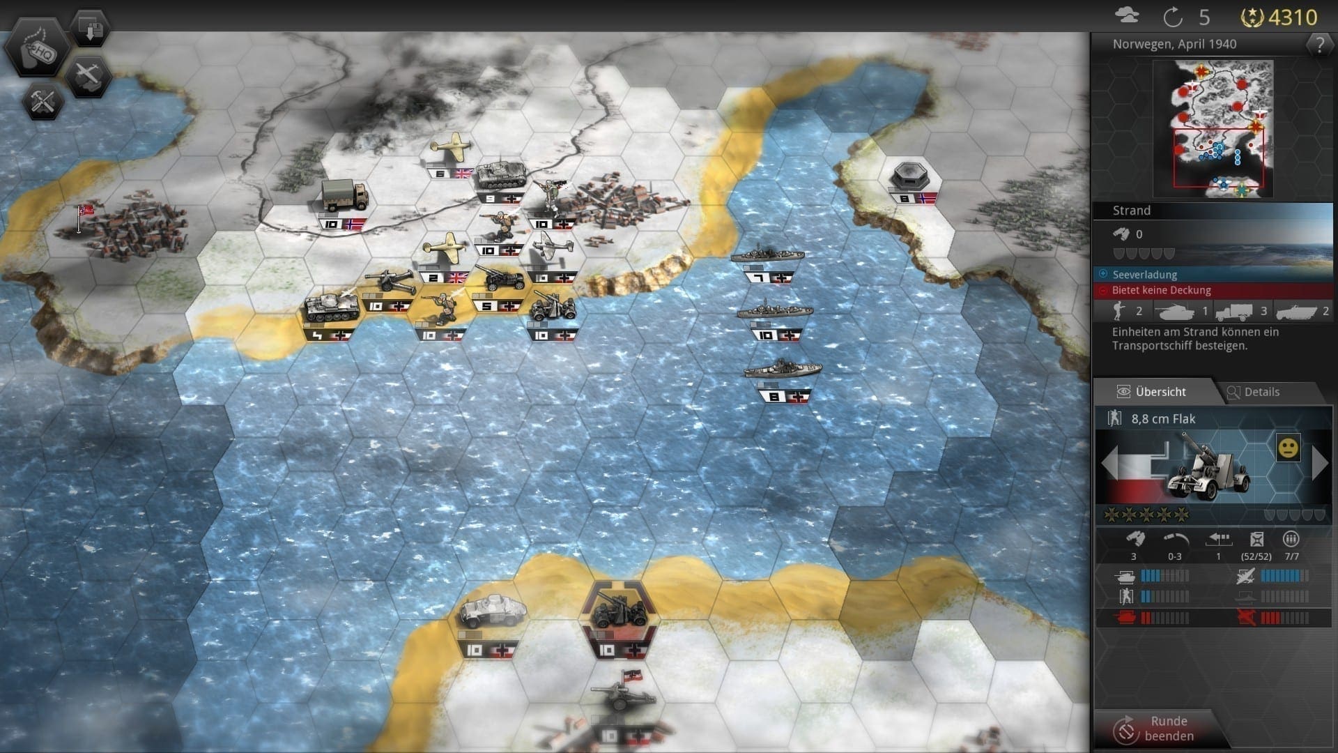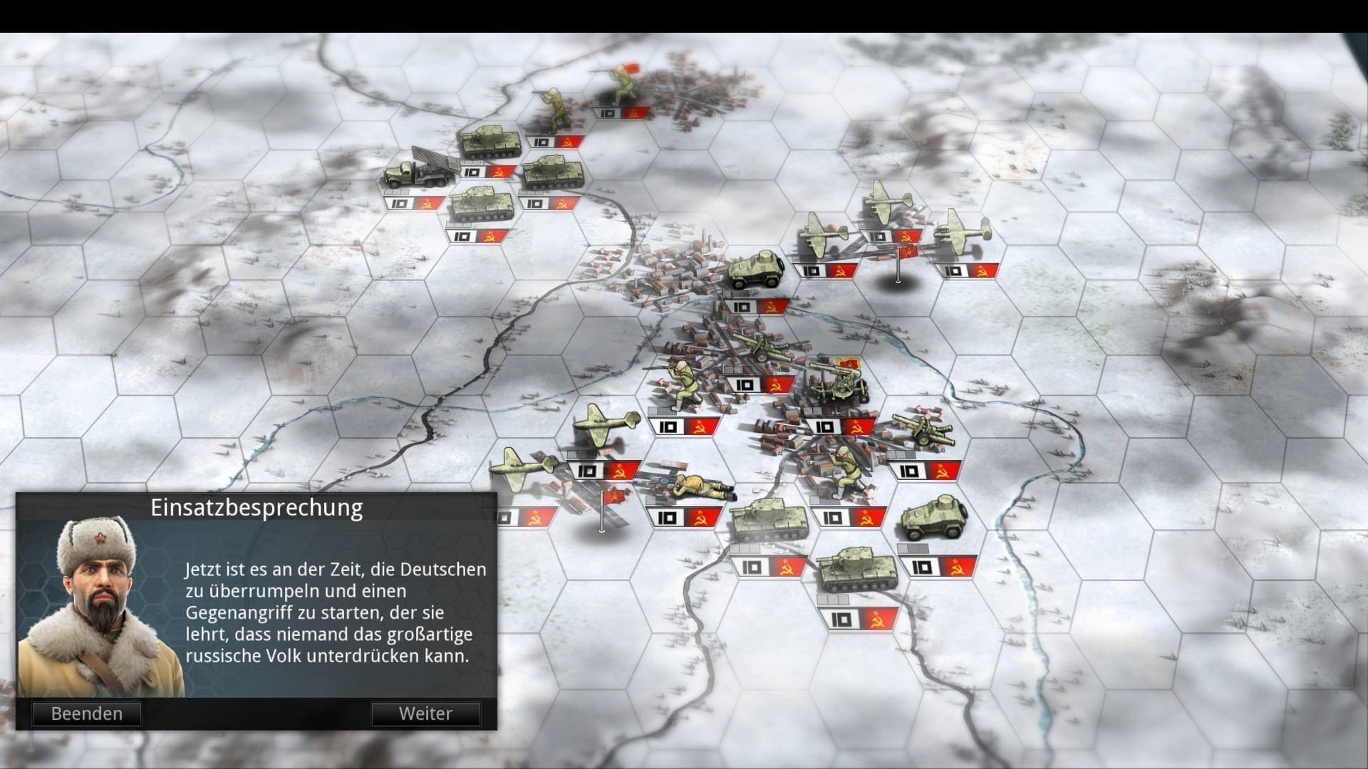 Unter dem Menüpunkt “Szenarien” verstecken sich lediglich die Einzelmissionen, welche während der Kampagne erfolgreich durchgespielt wurden und auch auf einen Mehrspielermodus wurde im Gegensatz zur Nintendo DS Version komplett verzichtet. Nicht ein Mal mehr die Hot-Seat Spielvariante hat es in das PC-Pendant geschafft. Stichwort Minimal: Vom Zusatz HD im Titel sollte man sich nicht irreführen lassen. Zwar wurde die Optik überarbeitet und an PC-Verhältnisse angepasst, aber einerseits wirken die comichaften Portraitbilder der Befehlsgeber in einem Weltkriegs-Spiel etwas deplaziert, andererseits ist die Visualisierung der Schlachten sehr spartanisch ausgefallen.