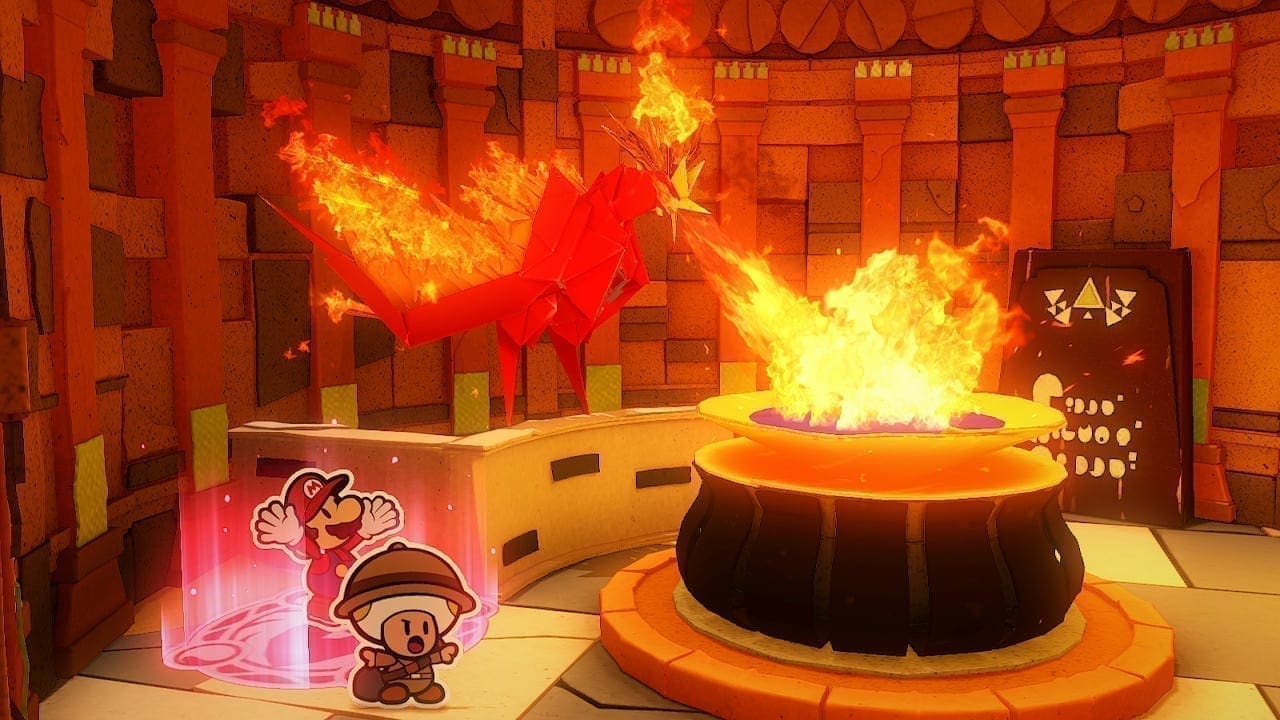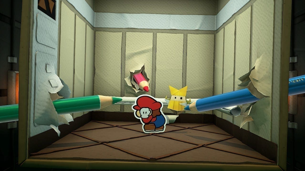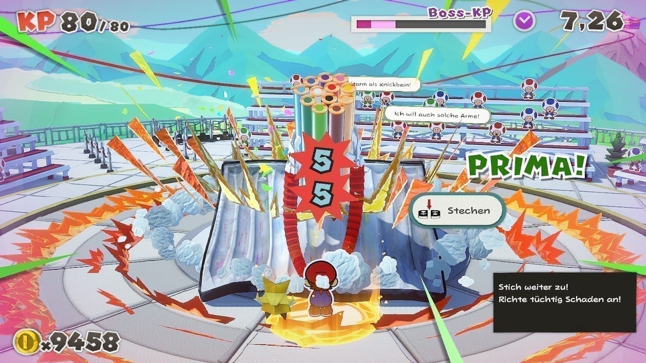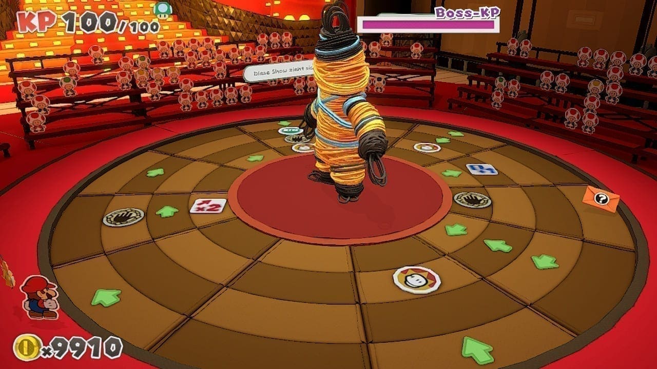 Nebst den in Origami verwandelten klassischen Schurken erwarten uns auch einige abstruse (Boss-)Gegner, wie z.B. ein größenwahnsinniger Malkasten oder ein durchgeknallter Locher. Letzteren stellen wir uns in entsprechenden Bosskämpfen, die das Kampfsystem in gewisser Weise auf den Kopf stellen. Diesmal sitzt der Boss in der Mitte der anordenbaren Kreise und Mario ist der Angreifer von außen. In den Ringen finden sich statt Gegnern Richtungspfeile, Pickups und Aktionssymbole. Den Richtungspfeilen folgt Mario blind, sammelt dabei brav alles auf seinem Weg liegende ein (Herzen, Power-Ups usw.), bis er auf ein Hindernis stößt oder auf einem Aktionssymbol landet. Diese erlauben ihn den Gegner anzugreifen, doch nicht jeder Angriff funktioniert zum Beispiel von jeder Seite gleich gut und manche Spezialangriffe gilt es erst über mehrere Kampfrunden vorzubereiten. Dabei kommt auch Olivia immer wieder zum Einsatz, die sich mit der Zeit in verschiedene Pergamentons, mächtige Papier-Elementare, falten kann. Welche Eigenmarke hier kräftig aufs Korn genommen wird, sollte eigentlich keiner Erklärung bedürfen.