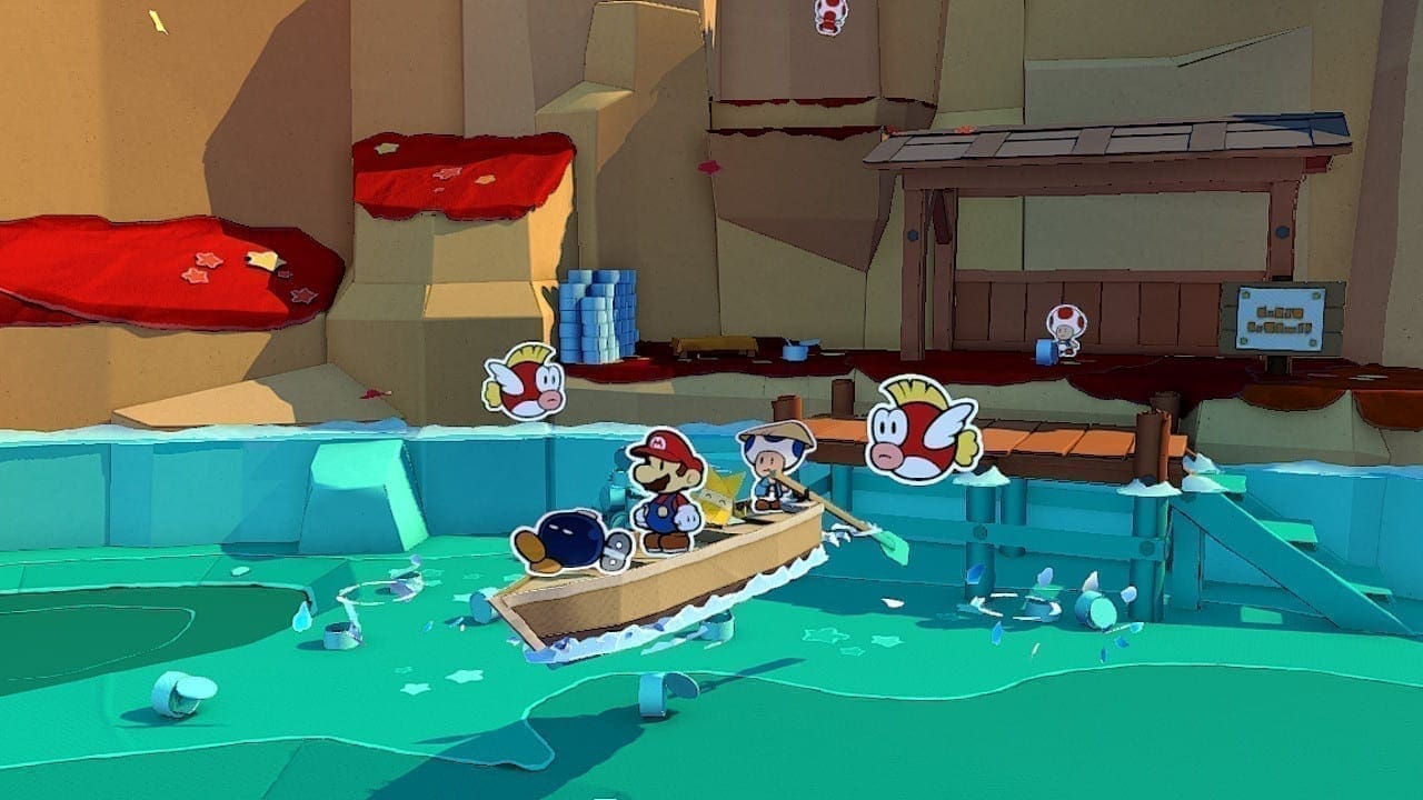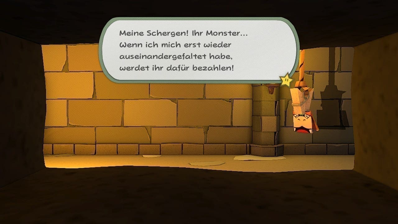 Die ersten Ableger der Paper Mario-Reihe mischten noch Rollenspiel-Elemente in den Genre-Mix, aber das ist – teilweise noch immer zum Unmut der Fans – schon länger passé. Auch die Jagd nach dem Origami-König ist „nur“ mehr ein Action-Adventure mit sanften Puzzle-Elementen, aber keinen wirklichen Rollenspielelementen mehr – zumindest im klassischen Sinn. Der Großteil des Spiels bietet gameplaytechnisch daher keine großen Überraschungen. Mit Mario & Co. erkunden wir unterschiedliche Teile des Pilzkönigreichs, stets auf der Suche nach den Enden der eingangs erwähnten Luftschlangen, welche uns daran hindern zu Prinzessin Peach vorzudringen. Nebst Schatzkisten und ?-Blöcken halten wir dabei auch die Augen nach armen Toads auf, die Opfer der Faltschergen wurden: Zusammengefaltet zu den unterschiedlichsten Origami-Kreationen, in Spalten gestopft oder zusammengeknüllt in eine Ecke geworfen, warten sie nur darauf, dass Mario sie mit einem liebevollen Hammerschlag wieder „glättet“ und damit rettet.