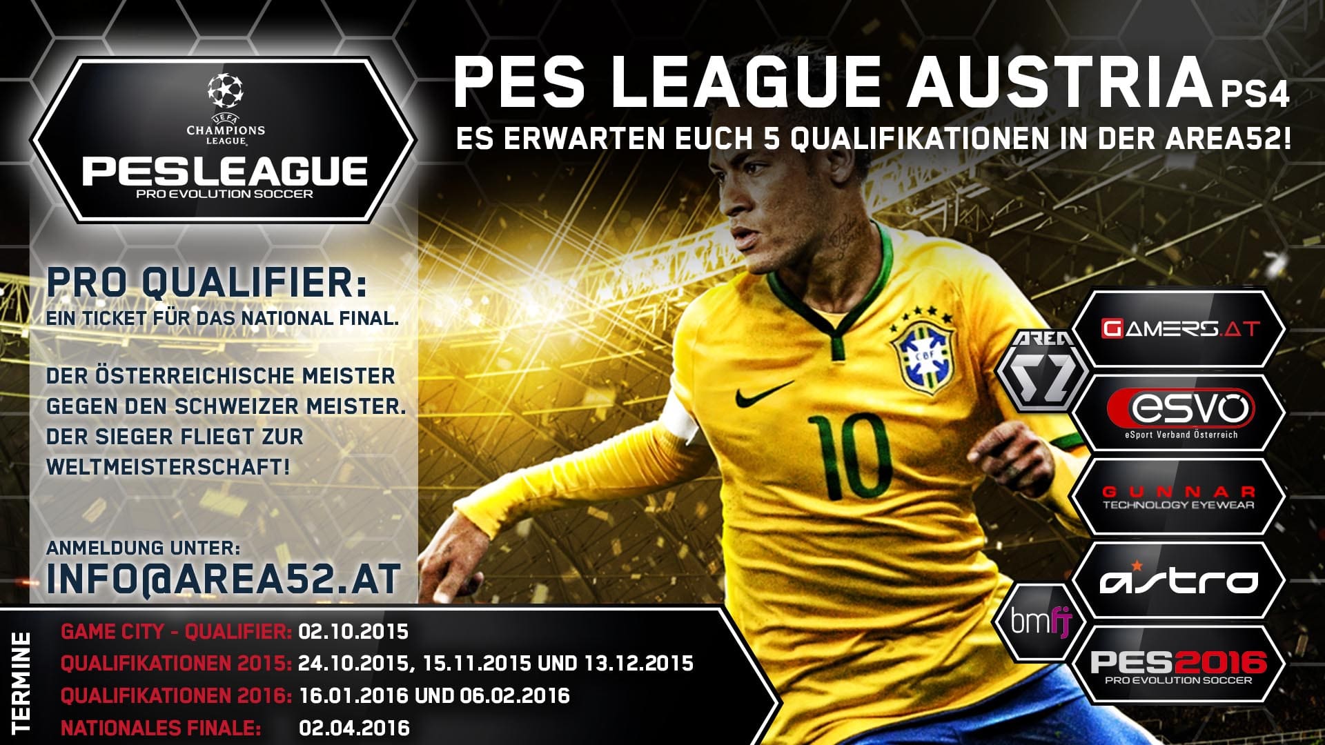 Insgesamt 16 Personen konnten sich von September 2015 bis Ende Februar 2016 für das PES League Austria 2016 Finale qualifizieren. Die Spieler hatten unterschiedliche Möglichkeiten ein Finalticket zu erobern, zum einen per PES Online Liga und zum anderen über verschiedene Turniere in Tirol, auf der Game City 2015 sowie in der AREA52.