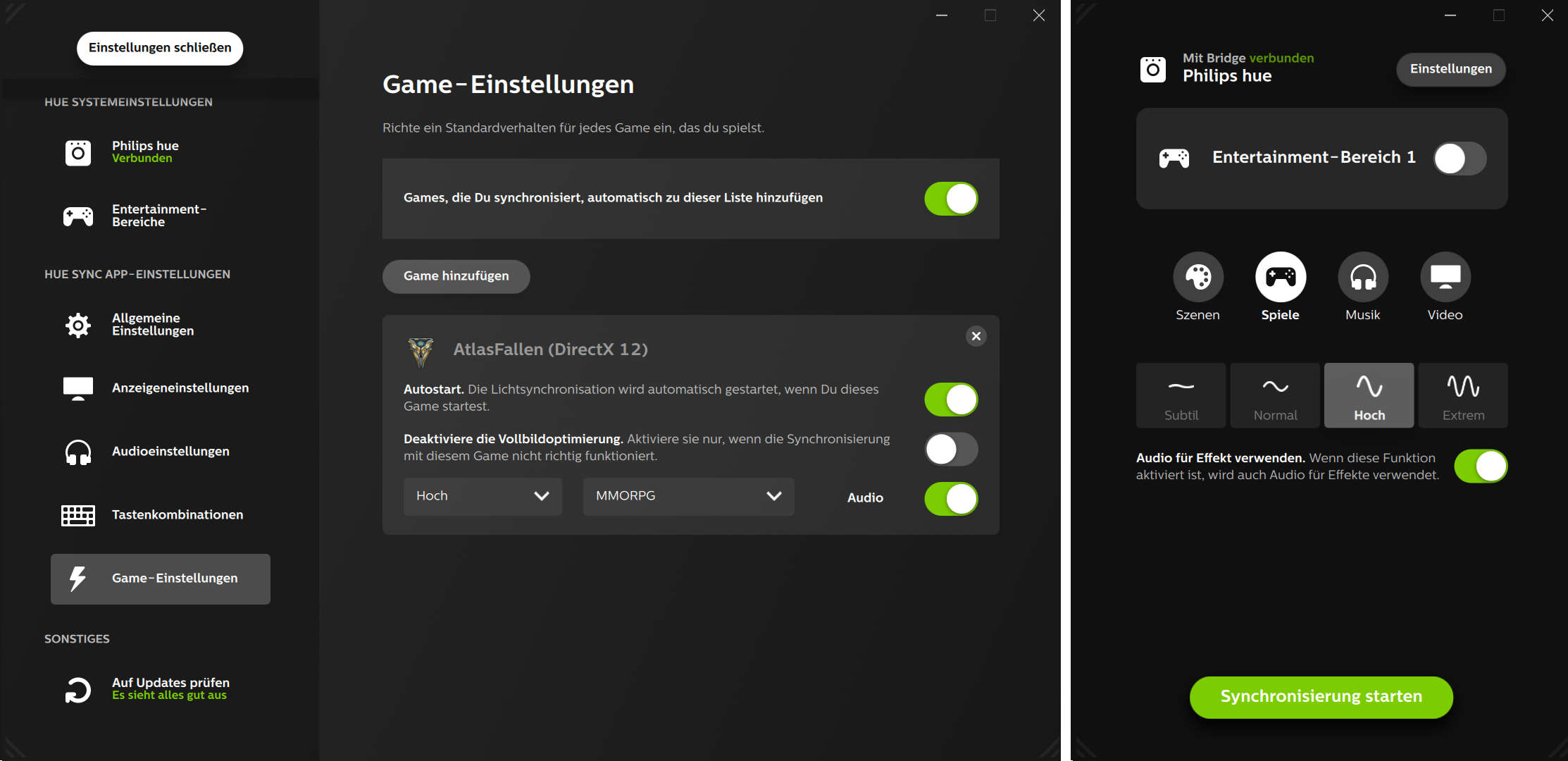 Der für uns weitaus wichtigste Bereich erweitert die Farben des Spielebereichs am Monitorrand auf die Rückwand. Wer möchte kann hier noch den Audio-Effekt dazu aktivieren. In den Einstellungen lassen sich dann auch für spezielle Spiele bestimmte Einstellungen festlegen. - Video