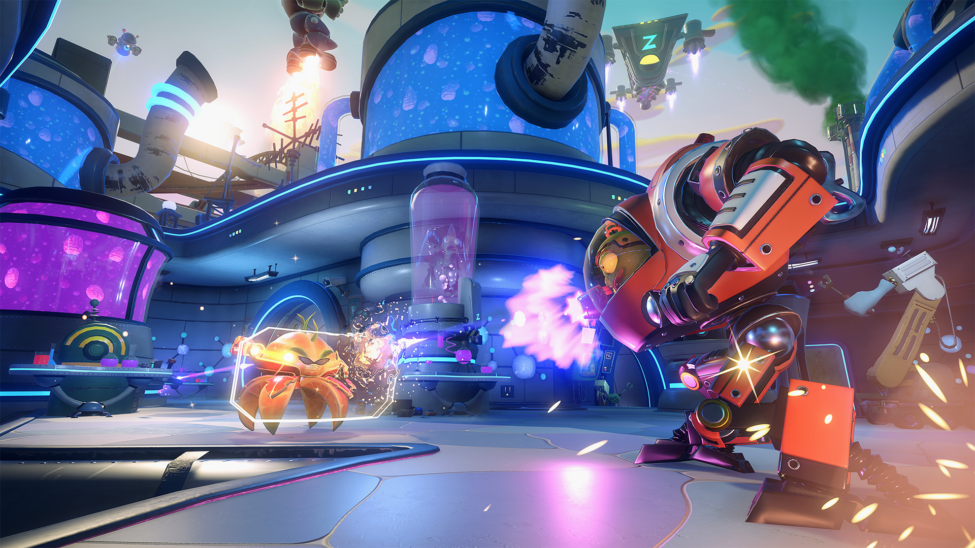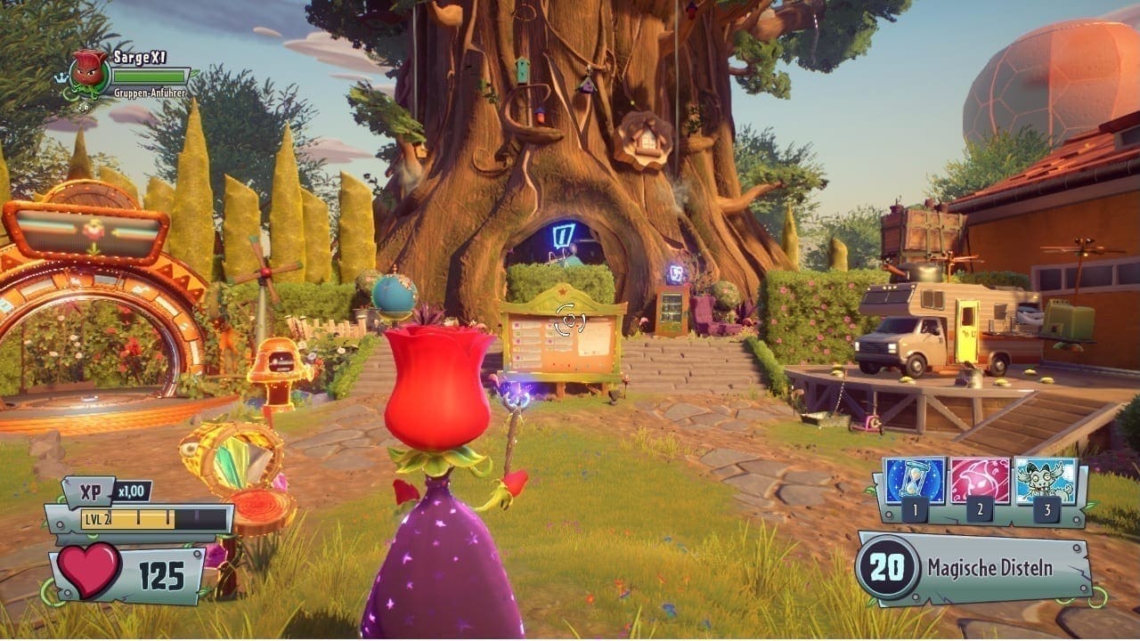 Mittendrin statt nur dabei, lautet scheinbar das Motto von Plants vs. Zombies Garden Warfare 2, denn statt schnöder Menüs wird unsere Spielfigur nach einem kurzen Gemetzel in einer liebevoll gestalteter Hub-Welt abgesetzt, dem so genannten „Hinterhof-Kampfplatz“. Dieser ist in drei verschiedene Abschnitte unterteilt: Zwei gegenüberliegenden Basen für Pflanzen und Zombies, sowie einer Kampfzone in der Mitte – dem Hinterhof. Als Spieler kann man sich in zumindest zwei dieser Bereiche frei bewegen – die jeweils gegnerische Basis ist jedoch immer gesperrt. Während man im eigenen Hauptquartier verschiedene Aktivitäten ausführen kann, wie beispielsweise das Individualisieren von Charakteren, Fraktionswechsel, Statistiken ansehen, Ingame-Shop besuchen oder Spielmodi auswählen, ist die Kampfzone eigentlich nur ein Spielplatz für den Solo-Spieler. Eine zusammenhängende Geschichte sucht man zwar vergeblich, dass es trotzdem nicht langweilig wird liegt daran, weil es neben diversen Mini-Spielchen mit Zomboss und Deppie Dave zwei NPC’s gibt, die den Spieler mit diversen Missionen versorgen. Diese gewinnen zwar keinen Innovationspreis und halten sich an das 08/15-Standard-Schema für solche Aufträge, sind aber relativ abwechslungsreich und sorgen für Kurzweil.