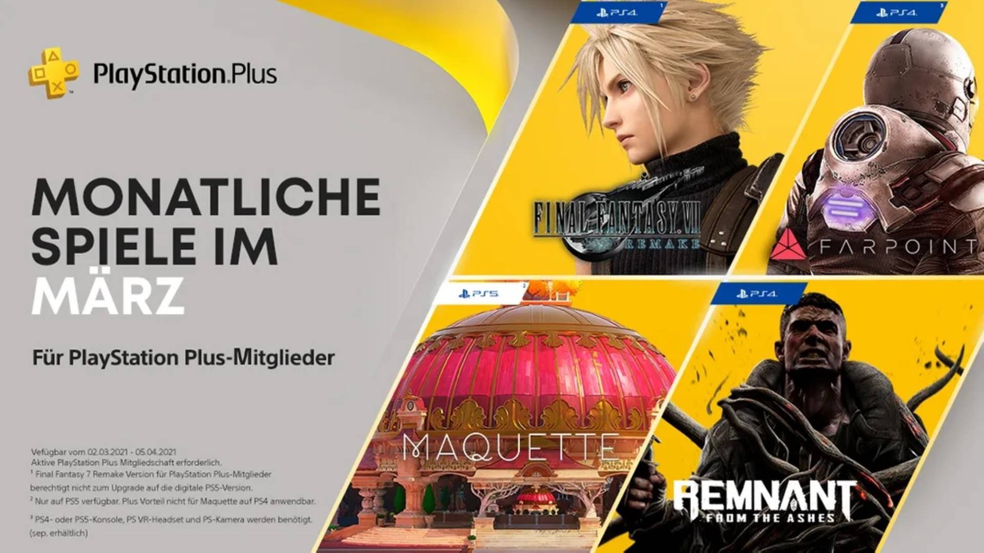 PlayStation Plus-Mitglieder erwartet im März 2021 vier spannende Plus-Spiele: Ab dem 2. März können sie die PS4-Spiele Final Fantasy VII Remake und Remnant: From the Ashes herunterladen. Besitzer einer PlayStation VR dürfen sich zudem auf Farpoint freuen. Auch die Neuerscheinung Maquette steht mit der Veröffentlichung am 2. März für Plus-Mitglieder zur Verfügung. Bis zum 5. April haben Spieler außerdem weiterhin die Möglichkeit, sich die actiongeladene und exklusive PS5-Neuerscheinung Destruction AllStars zu sichern.