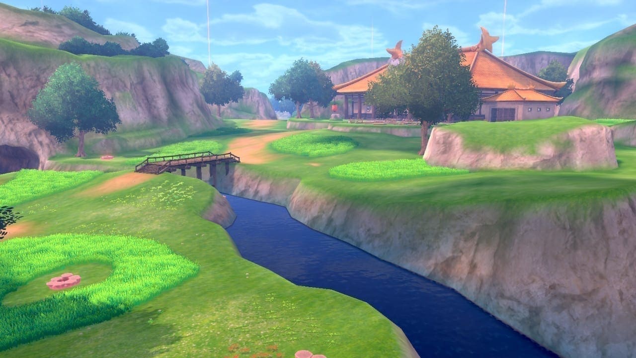 Die neue Insel der Rüstung wurde dabei wie die bereits bekannte Naturzone aufgebaut und stellt eine Art „Open-World“ dar. Es gibt diesmal keine festgelegten Pfade, sondern wir können uns ganz frei durch die Wildnis voller herumlaufender Pokémon bewegen. Dabei gilt es stets abzuwägen, ob wir unseren Gegnern bereits gewachsen sind oder doch ein anderer Weg eingeschlagen werden sollte. Nach einem ersten Kampf, welcher uns auf der Insel begrüßt, können wir also unseren ganz eigenen Weg wählen. Wir werden nicht einmal dazu gezwungen direkt zum Dojo der Insel zu radeln – dem großen Feature des DLCs, welches ich später noch genauer vorstelle.