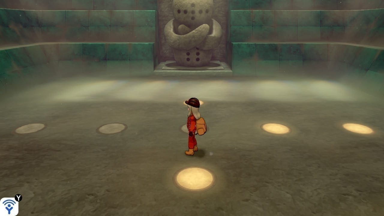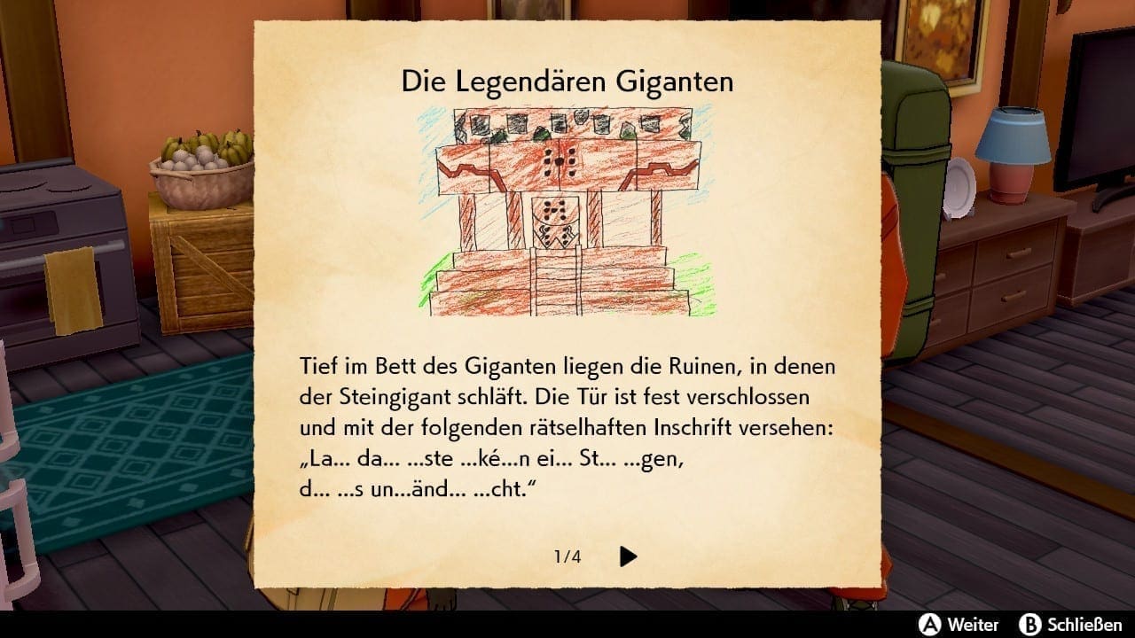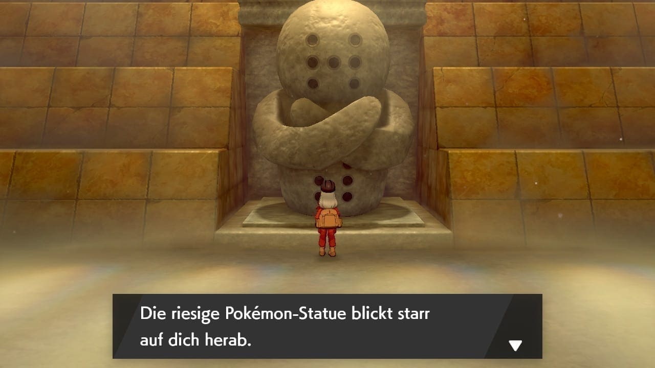 Für die Rätsel muss man da teilweise auch wirklich oft aus einem anderen Blickwinkel denken. Denn einmal muss ich vor einer Tür pfeifen, einmal muss ich ein Schneeflocken-Pokémon an erste Stelle meines Teams setzen, und einmal dem ersten Pokémon des Teams einen Ewigstein geben. Die Rätsel zeigen sich dabei immer mit Textlücken und nur kryptischen Hinweisen.