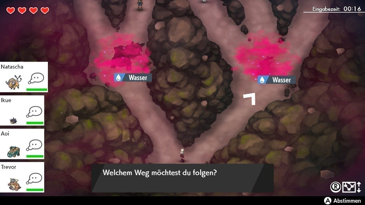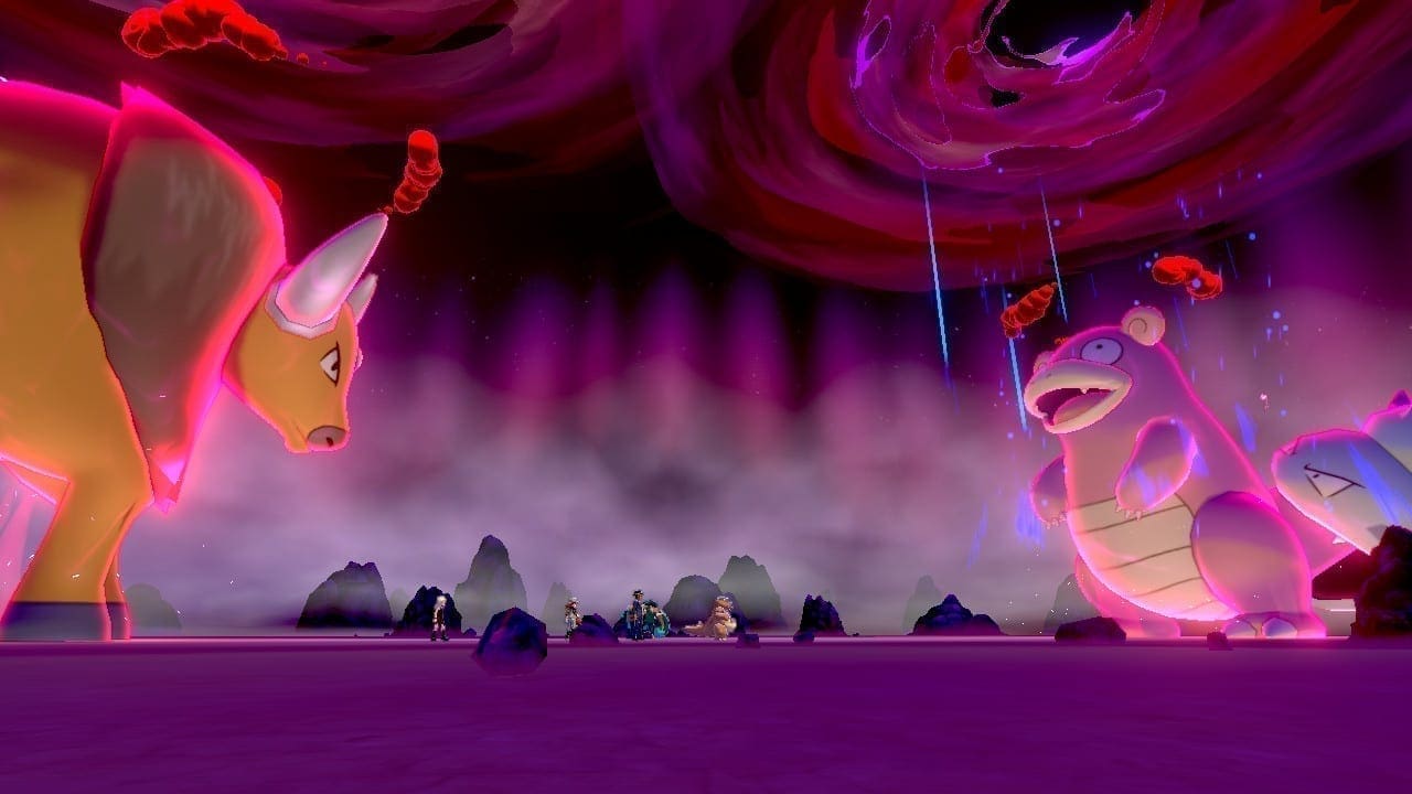 Gleich in den ersten Zügen des bereits erwähnten Abenteuers führt uns das Spiel dabei zu einem der größten neuen Features: dem Dynamax-Abenteuer. Dieses erweist sich als Koop-Labyrinth, was alleine, oder gemeinsam mit bis zu vier Spielern bestritten werden kann. Gekämpft wird hier jedoch nicht mit den eigenen Pokémon. Diese könnten im Labyrinth aufgrund der dort vorherrschenden, intensiven Galar-Partikel nicht kämpfen. So wählt jeder Spieler vor Beginn eines Dynamax-Abenteuers eines der ihm zufällig angebotenen Pokémon aus.