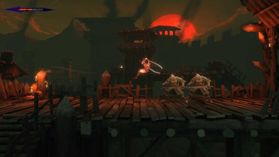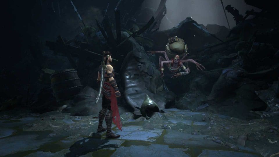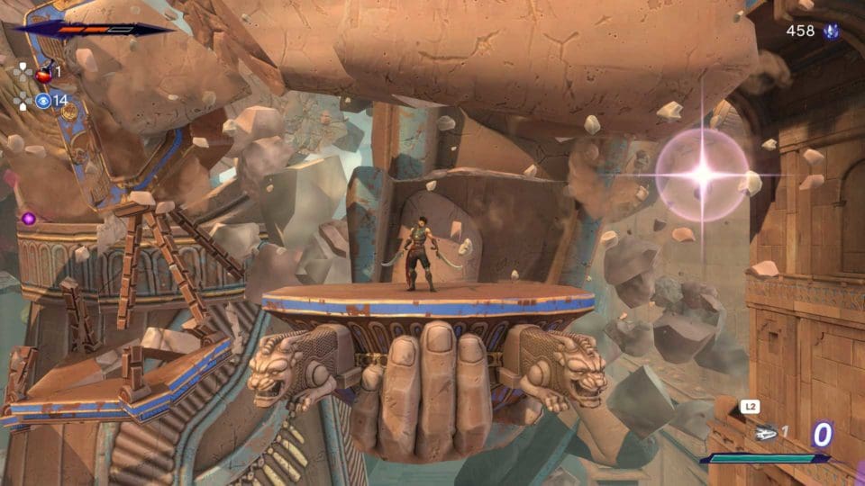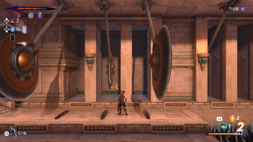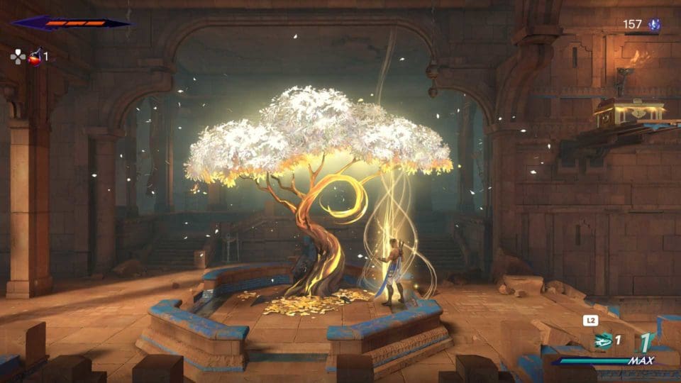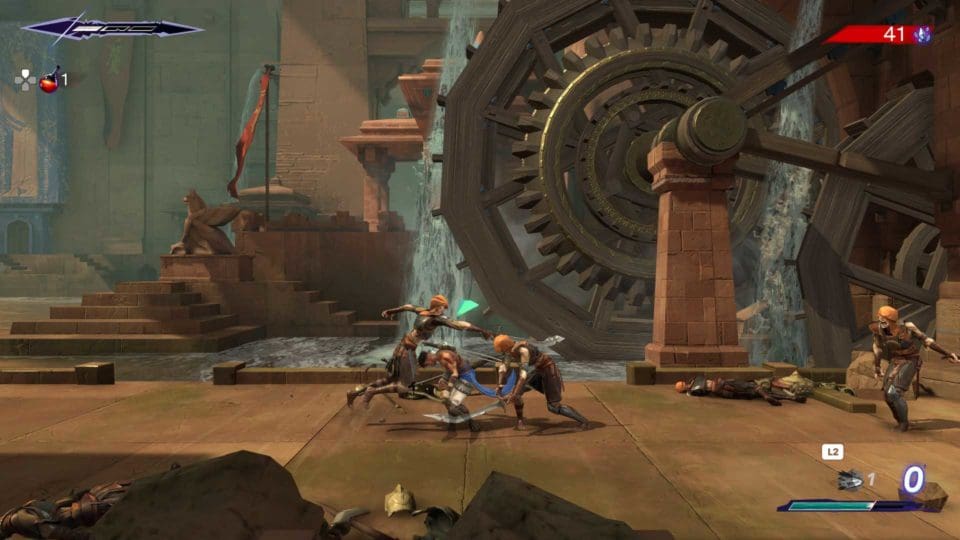 Anfangs nur mit zwei Schwertern bewaffnet, bekommen wir etwas später auch noch einen Bogen, der nicht nur Pfeile im Kampf verschießen kann, sondern auch mittels „aufgeladenem Schuss“ eine Energiekugel erzeugt, die Schalter umlegen kann. Aber auch unsere Fähigkeiten, im Spiel „ATHRA-Kraft“ genannt, lassen sich erweitern, so bekommen wir unter anderem auch einen wichtigen Super-Dash, mit dem man sich in der Luft schnell bewegen kann, oder auch einen Teleporter zur Verfügung. Wir erstellen an einem Ort ein Spiegelbild von uns und können von weiter Weg per Knopfdruck zu unserem Ebenbild teleportieren. Eine mächtige Fähigkeit um kniffelige Stellen im Spiel zu überwinden. Später kann die Zeit zurück gespult werden (erinnert an Sands of Time), oder man sammelt unterwegs Amulette auf, welche ausgerüstet werden können und verschiedene Boni gewähren; wie bessere Gesundheit oder eine bessere Angriffsstärke.