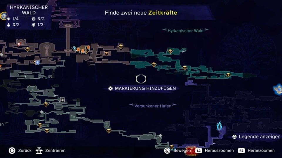 Mit einem „Magischen Auge“ können wir uns zumeist (ist manchmal nicht möglich) eine Karte der Spielewelt einblenden um nicht die Übersicht zu verlieren. Eine Legende erklärt uns die einzelnen Symbole und so können wir gleich mal sehen ob ein Bereich evtl. noch nicht begehbar ist, wo es Speichermöglichkeiten gibt. bzw. auch wo wir zuletzt gestorben sind. Ebenso werden Quests markiert, Händler, Schnellreisepunkte und weitere wichtige Orte. Als eine zusätzliche Hilfe können wir im Spiel auch selbst „Screenshots“ machen von wichtigen Orten, die dann auf der Karte angeheftet werden. Das ermöglicht es, später wichtige Schatztruhen oder andere noch nicht begehbare Bereiche wieder leichter zu finden.