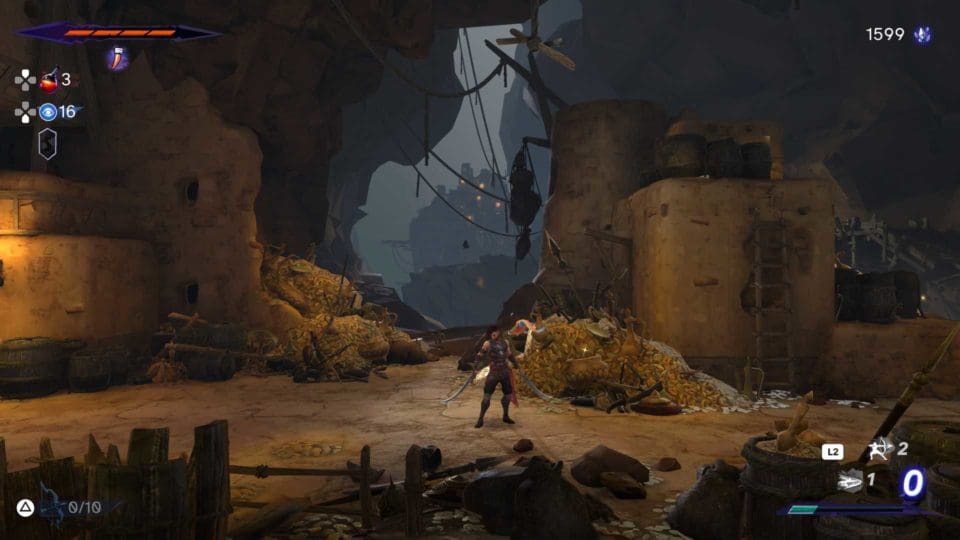Alle diese Verbesserungen lassen sich durch Lösen von Quests in Truhen finden oder bei Händlern erwerben. Als Zahlungsmittel zählen dabei Kristallsplitter oder seltene Münzen, die gefunden oder im Kampf erbeutet werden können. Selbst Teile der Übersichtskarte lassen sich kaufen und bei einem Schmied können wir unsere Waffen verbessern lassen. Das ist auch bitter notwendig, denn schneller als uns lieb ist, ereilt uns auch der Tod, wenn die Gesundheitsleiste unerbittlich keinen Balken mehr hat. Wir haben zwar den einen oder anderen Heiltrank zur Verfügung, aber oft reicht das nicht aus und wir beißen ins Gras oder den Sand, je nachdem wo wir uns gerade befinden. Neu starten können wir dann bei sogenannten Respawn-Punkten, oder auch zuvor entdeckten Waq-Waq-Bäumen, deren Aufenthaltsort uns auch mit „gelben Geruchsfahnen“ angezeigt wird. Dort können wir quasi speichern, unsere Gesundheit auffüllen und unsere Amulette ausrüsten.