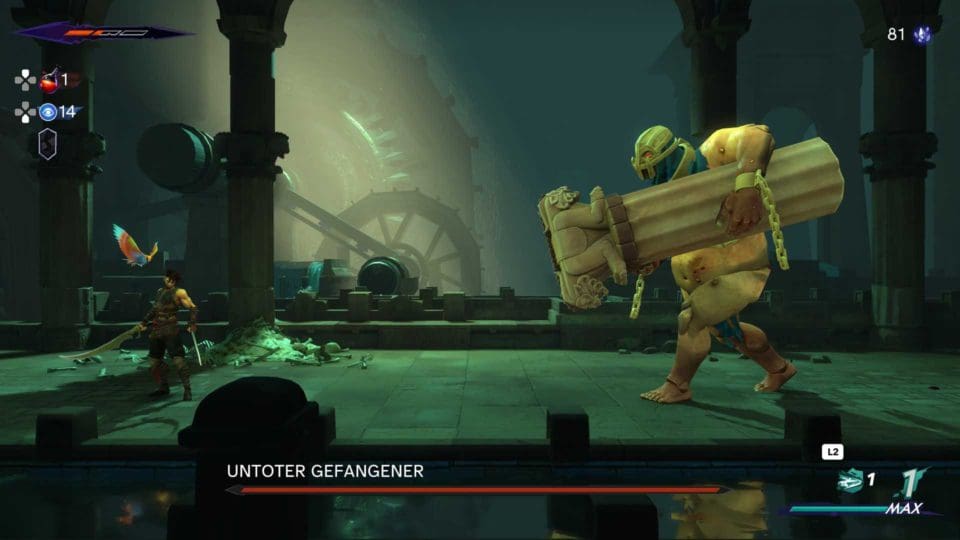 Wie es sich für einen „Plattformer“ gehört, ist die Steuerung präzise und durchdacht umgesetzt worden. Vorausgesetzt man verwendet ein Gamepad am PC, das empfiehlt das Spiel auch gleich zu Beginn, sollte kein Controller am PC erkannt werden. Bei unserem Test kam ein PS5-Controller bzw. ein XBox One Gamepad zum Einsatz, damit lies sich unser Held genau und exakt im Kampf und durch heikle Sprungpassagen steuern. Der Stadia Controller wurde nicht erkannt. Die Tasten sind zum Teil mehrfach belegt um diverse Combos und Fähigkeiten durchführen zu können, aber das Ganze fühlt sich nach etwas Eingewöhnungszeit nicht überladen an und rasch hat man die meisten Combos verinnerlicht.