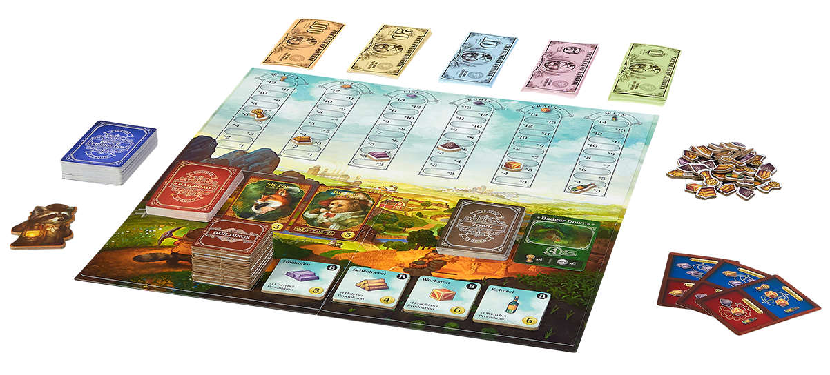 Die Materialien sind hochwertig und thematisch gestaltet. Die Karten und Marker sind robust, und das Design ist farbenfroh und einladend. Das Spiel enthält Rohstoffmarker, Geldscheine, Stadt- und Gebäudekarten, die alle gut verarbeitet sind. Die Spielercharaktere sind unterschiedliche Säugetiere, gezeichnet im Stil des 18. Und 19. Jahrhunderts. Diese sind mit dem restlichen Spielmaterial sehr stimmig.