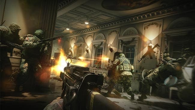 Grafisch haut einem der Shooter auf der Konsole zwar in Punkto Details generell nicht gerade vom Hocker, dafür ist die Framerate in jeder Situation stabil und die Grafikengine perfekt auf Geschwindigkeit und Zerstörung ausgelegt. Fast schon huldigen möchte man da den Programmierern ob soviel Möglichkeiten die Umgebungen zu zerstören. Vernagelte Fenster können eingeschlagen, Türen aufgesprengt werden und Schüsse pfeifen uns durch dünne Holzwände um die Ohren. Aber damit noch nicht genug lassen sich bestimmte Wände mit einem Hammer einschlagen, verstärkte Barrikaden mit Spezialsprengstoff demolieren und alles mögliche an Gegenständen kurz und klein schießen. Mit der MP im Anschlag brechen wir durchs geschlossenen Fenster ein, sprengen Bodenluken auf und schießen durch eine Gipskartonwand auf den Gegner. Da bleibt wirklich kein Auge trocken und das macht durch diese vielen Möglichkeiten jeden Einsatz so einzigartig.