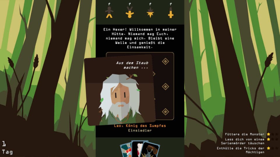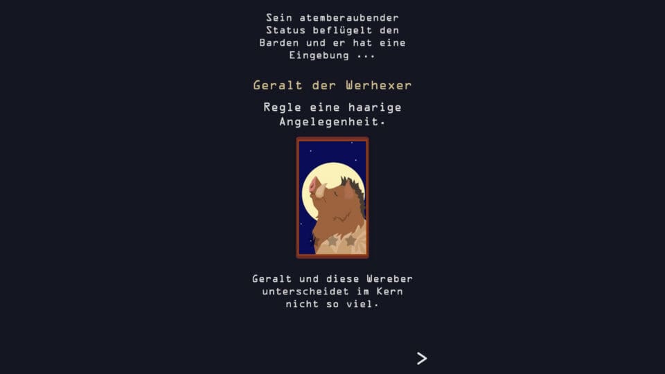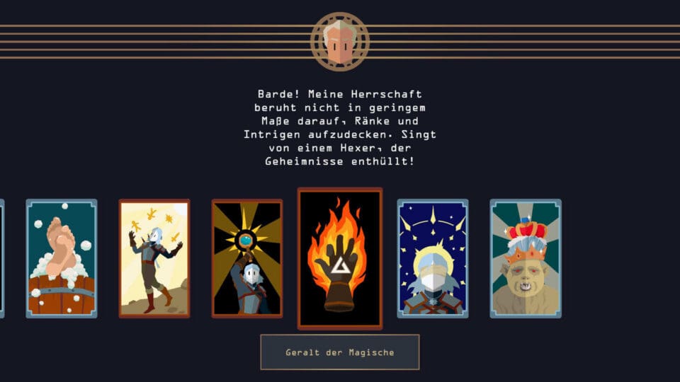Nun hat Entwickler Nerial den Hexer zu einem Teil seiner erfolgreichen Reigns-Reihe machen dürfen. Spielmechanik wie Grafik eint hier der puristische Ansatz: Karten mit einer kurzen Situationsbeschreibung erscheinen und fordern eine schnelle Entscheidung, dazu wischst man nach links oder rechts bis irgendwann das Geschick erlischt und man auf die eine oder andere blutige Weise das Zeitliche segnet.