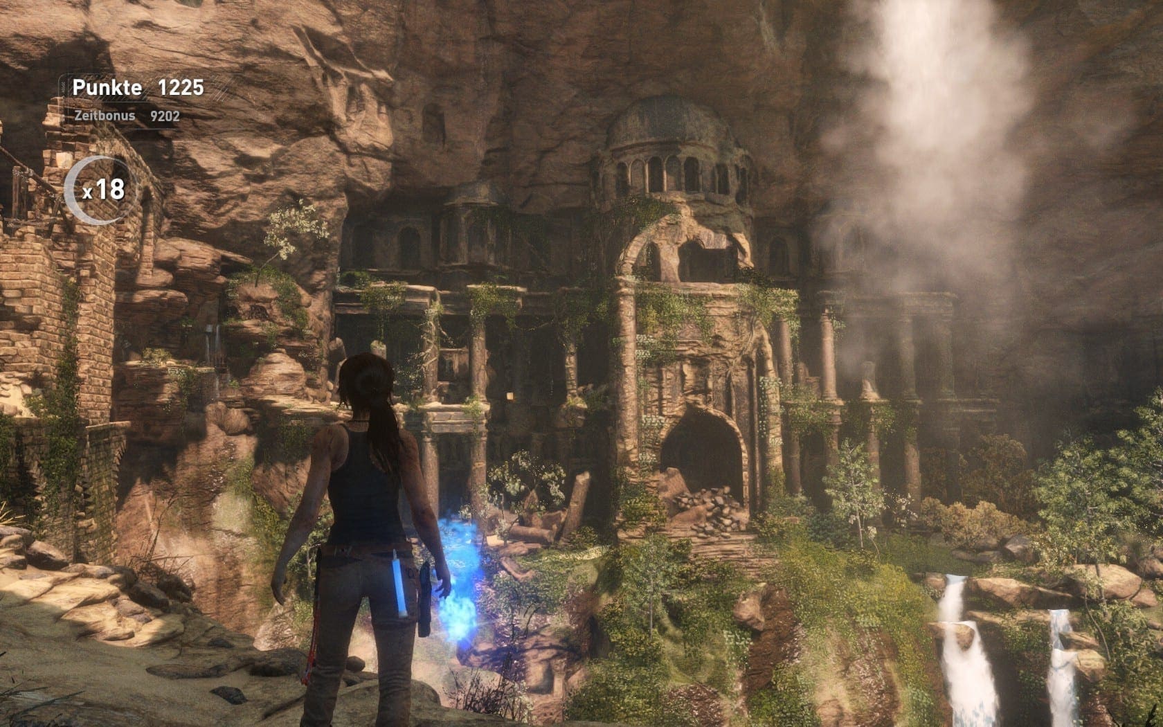 Einer der größten Kritikpunkte des Vorgängers war das actionreiche Gameplay, indem der Spieler von einer Ballerei meist direkten in die nächste geschickt wurde. Rise of the Tomb Raider will dagegen zurück zu den Wurzeln und steht deshalb ganz unter dem Motto „Rückkehr zur Grabräuberei „. Nicht nur storytechnisch verschlägt es Lara daher endlich wieder in antike Grabstätten, auch spielerisch orientiert man sich an den ersten Abenteuern der taffen Archäologin. Erkunden, klettern, springen und Geheimnisse lösen stehen wieder im Mittelpunkt. Natürlich darf man von Zeit zu Zeit auch wieder zur Waffe greifen und kämpfen, aber man kann nun selbst entscheiden ob man die Gegner mittels Guerilla-Taktik ausschaltet indem man sich auf Bäumen oder im Gebüsch versteckt, mit Bomben und Sprengsätzen für Ablenkung sorgt oder ob man wie Rambo seine Feinde auf die brachiale Methode eliminiert. Die meiste Zeit verbringt man aber in unterirdischen Höhlen oder riesigen Grabkammern, springt von Plattform zu Plattform und löst dabei mehr oder weniger kniffelige Schalterrätsel.