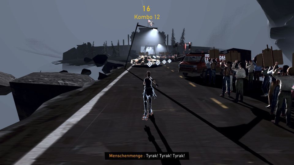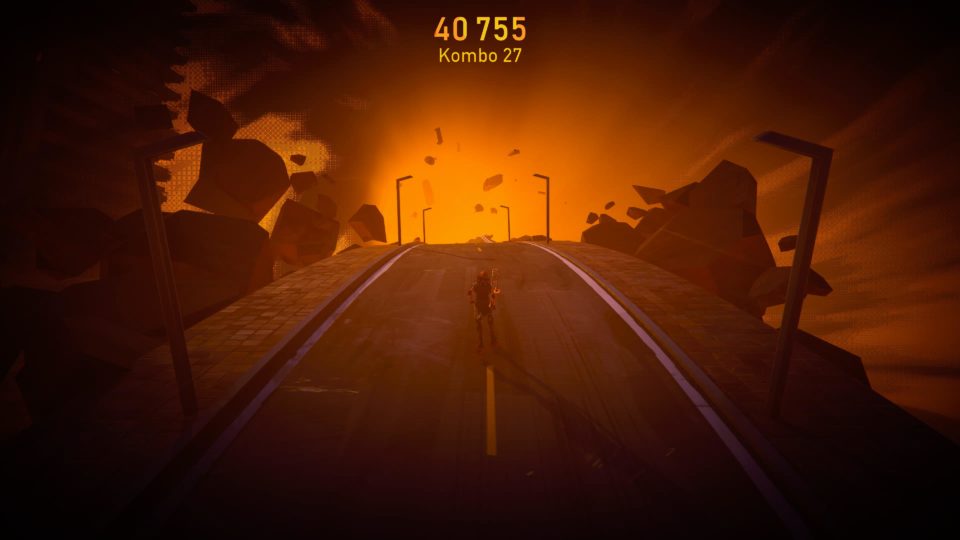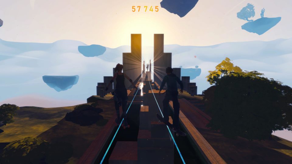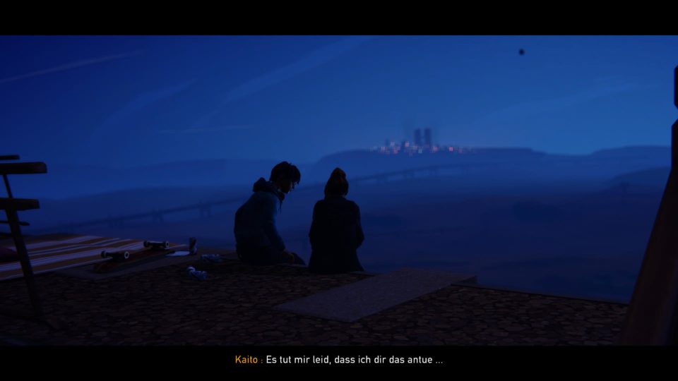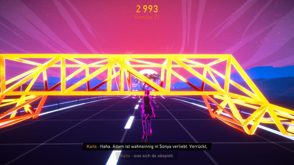 Während Zoe und Kaito diverse kleine Abenteuer und dabei viele witzige Momente erleben, kommen die Beiden aber auch immer wieder in brenzliche Situationen. Da so eine Freundschaft nicht nur Höhen, sondern auch Tiefen hat, führen sie auch des Öfteren sehr ernste Gespräche miteinander. Vorsicht ist hier bei den Antworten gegeben da diese den Verlauf der Geschichte mal mehr mal weniger beeinflussen. Auch bei fremden Personen kann eine falsche Antwort für Misstrauen sorgen und somit unser Vorhaben in diesem Moment zunichtemachen. Wenn eine Unterhaltung uns mal extrem mitnimmt, durchleben wir dieses Gedankenkarussell in Form eines Rennens. Ja klingt komisch, ist aber tatsächlich eine fantastische Idee das ganze bildlich dazustellen. Wir rasen also mit Skateboard oder Rollerblades durch wundervoll designte Level, weichen dabei Hindernissen aus und sammeln Punkte. Diese Rennen können wir dann unabhängig vom Ergebnis wiederholen, wenn wir das möchten. Bei der musikalischen Untermalung sollte man das auch unbedingt machen. Während wir einem riesigen Charakter entkommen, dabei coole Stunts abliefern und dann auch noch The Offspring aus den Boxen dröhnt, ja dann WILL man den Level einfach immer wieder spielen!
